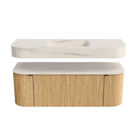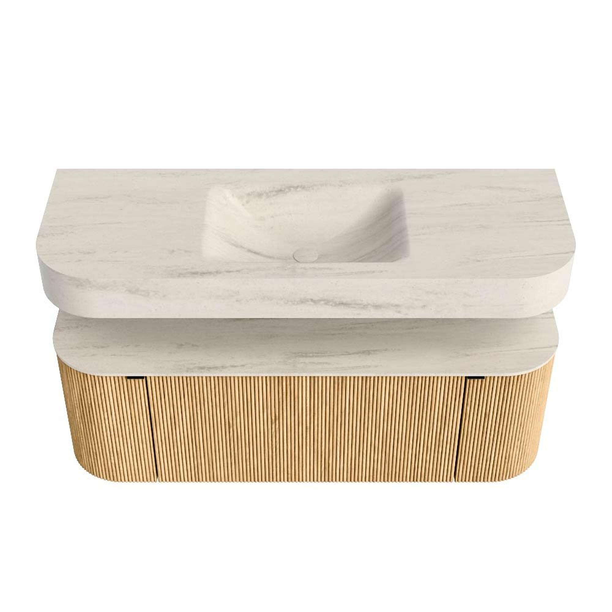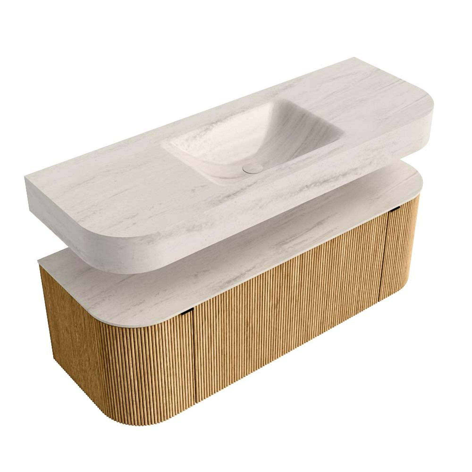 MONDIAZ THOR-DLUX 130cm badmeubel ronding links + rechts kleur Oak met 1 lade en 2 deuren. Vrijhangende wastafel CLOUD Midden zonder kraangat kleur Meli.