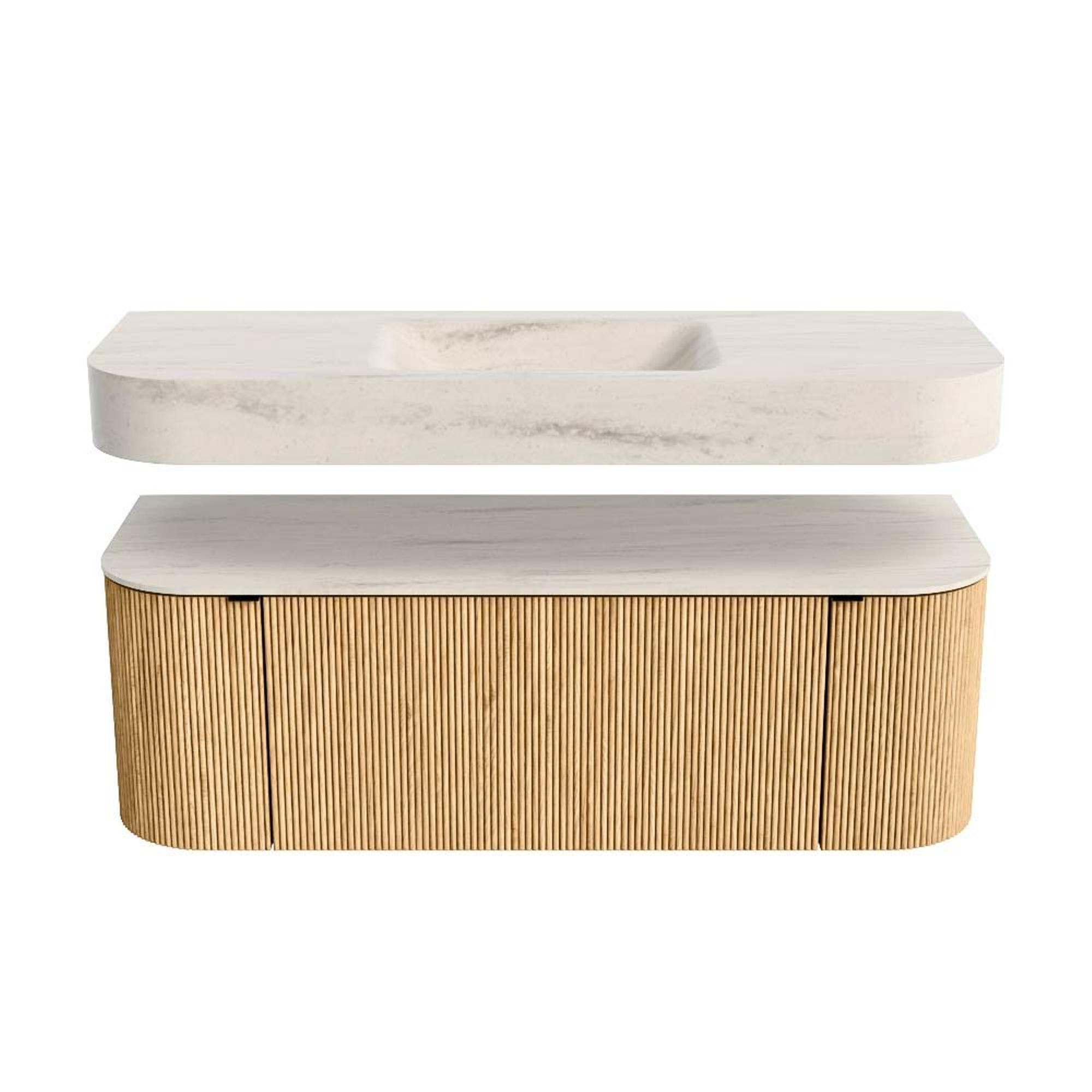 Boven het meubel zweeft een bijpassende, vrij hangende wastafel met afgeronde hoeken – perfect afgestemd op de vorm van de kast. De wastafel is uitgevoerd in Solid Surface en volgt subtiel de lijnen van het onderliggende meubel, waardoor een harmonieus geheel ontstaat. Het Solid Surface topblad vormt een sterke, onderhoudsvriendelijke basis en maakt de combinatie compleet.