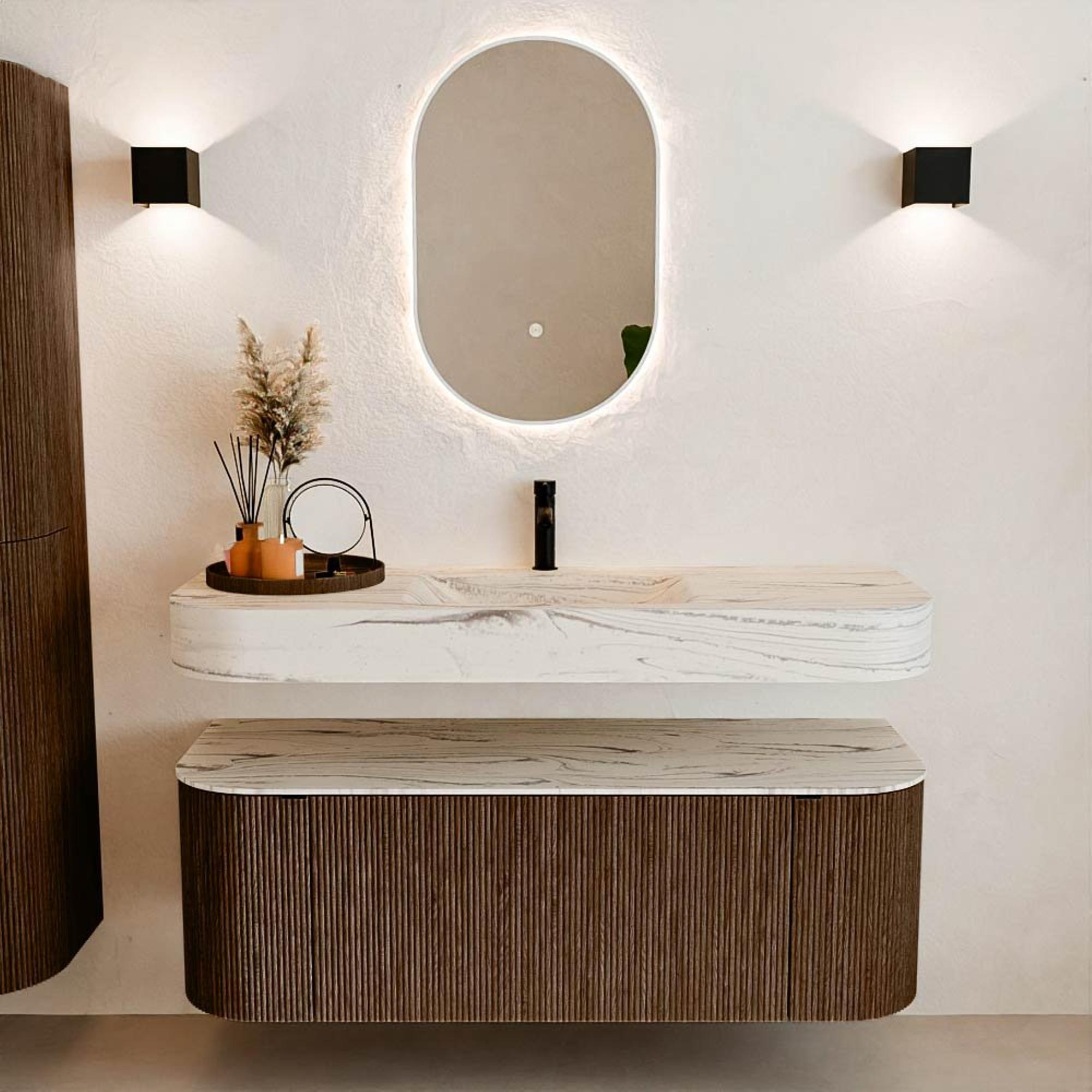 Natuurlijke materialen in warme tinten. De verticale ribbels brengen ritme en textuur in het ontwerp, terwijl het eikenhout zorgt voor een warme, ambachtelijke uitstraling. Kies uit 5 houttinten OAK, WALNUT, DUSK, SHADOW en RUBY zorgvuldig geselecteerde houtkleuren om zowel moderne als klassieke badkamers te verrijken.