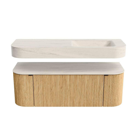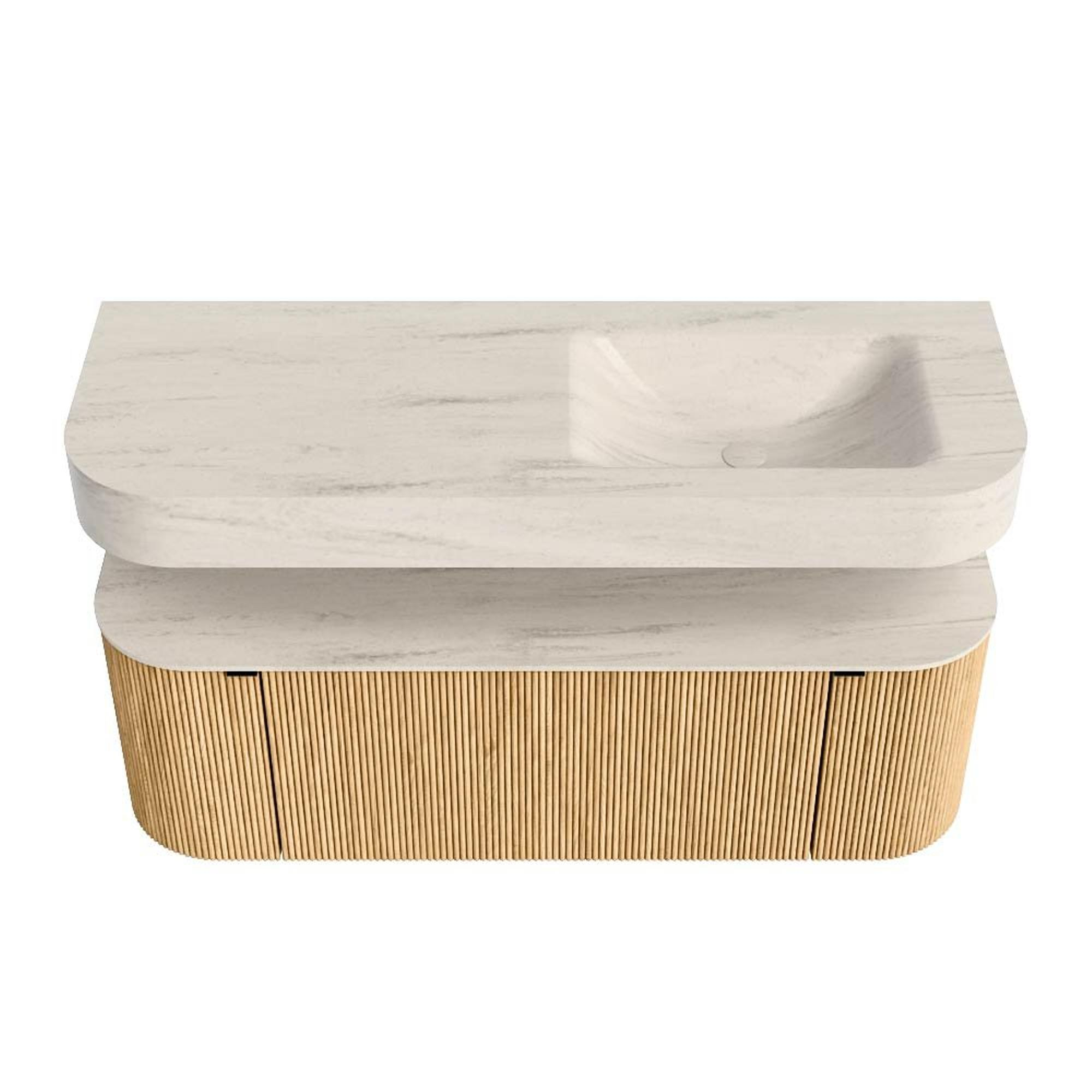 MONDIAZ THOR-DLUX 130cm badmeubel ronding links + rechts kleur Oak met 1 lade en 2 deuren. Vrijhangende wastafel CLOUD Rechts 1 kraangat kleur Meli.