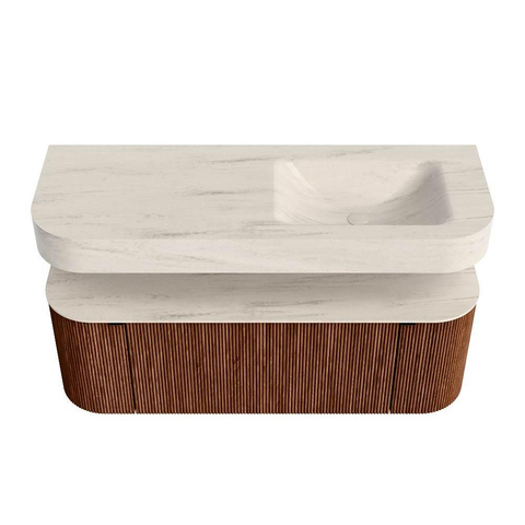 MONDIAZ THOR-DLUX 130cm badmeubel ronding links + rechts kleur Ruby met 1 lade en 2 deuren. Vrijhangende wastafel CLOUD Rechts 1 kraangat kleur Meli.