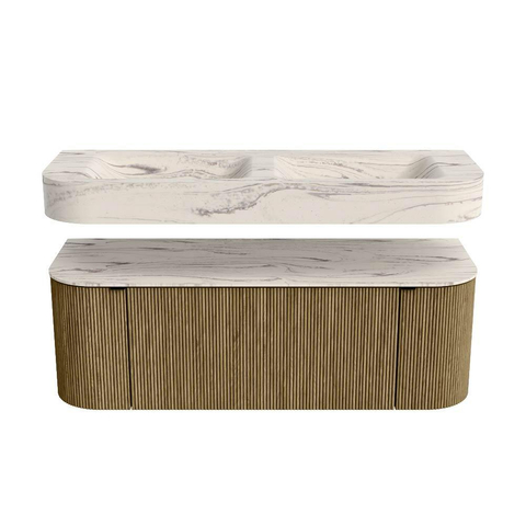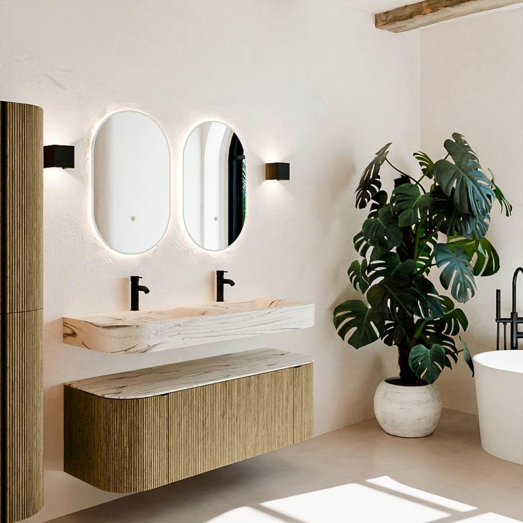 Natuurlijke materialen in warme tinten. De verticale ribbels brengen ritme en textuur in het ontwerp, terwijl het eikenhout zorgt voor een warme, ambachtelijke uitstraling. Kies uit 5 houttinten OAK, WALNUT, DUSK, SHADOW en RUBY zorgvuldig geselecteerde houtkleuren om zowel moderne als klassieke badkamers te verrijken.