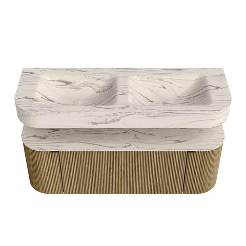 MONDIAZ THOR-DLUX 130cm badmeubel ronding links + rechts kleur Dusk met 1 lade en 2 deuren. Vrijhangende wastafel CLOUD Dubbel 2 kraangaten kleur Nata.