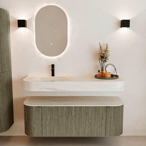 Boven het meubel zweeft een bijpassende, vrij hangende wastafel met afgeronde hoeken – perfect afgestemd op de vorm van de kast. De wastafel is uitgevoerd in Solid Surface en volgt subtiel de lijnen van het onderliggende meubel, waardoor een harmonieus geheel ontstaat. Het Solid Surface topblad vormt een sterke, onderhoudsvriendelijke basis en maakt de combinatie compleet.
