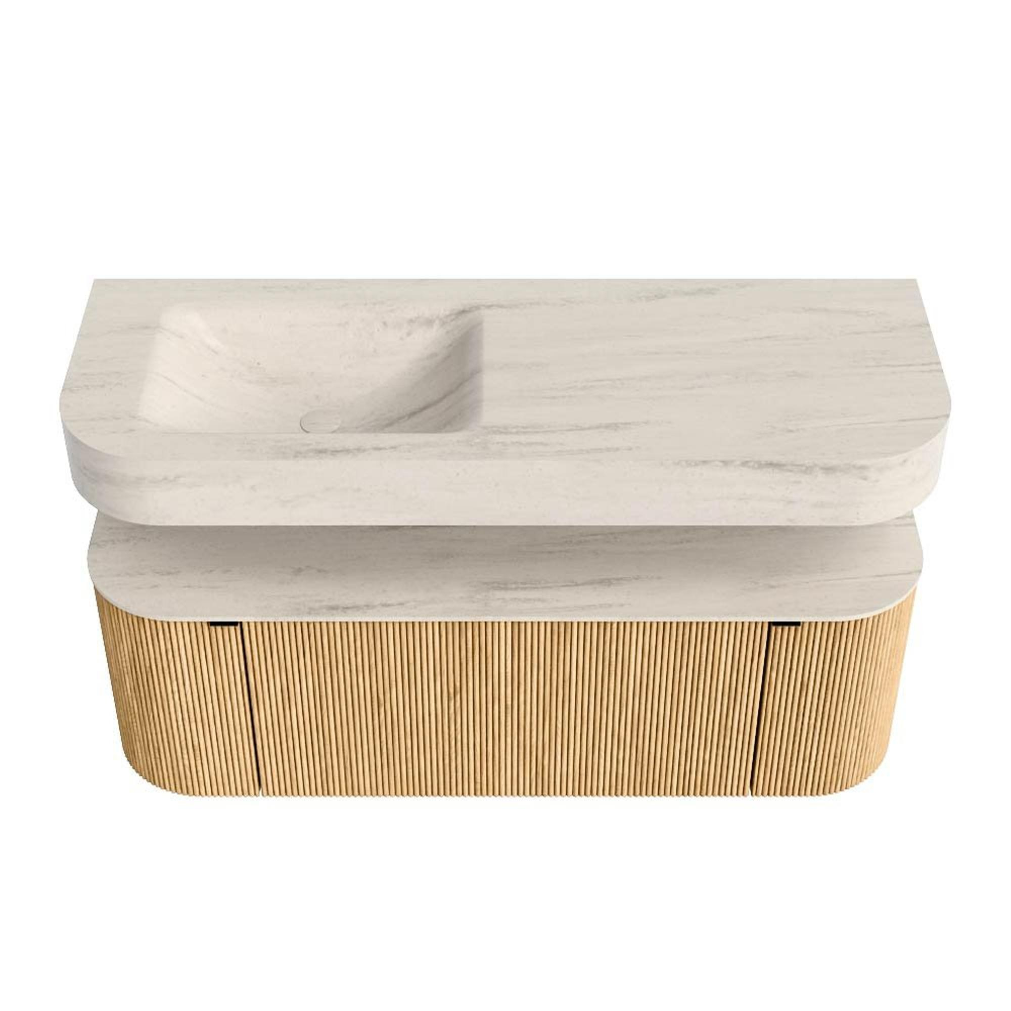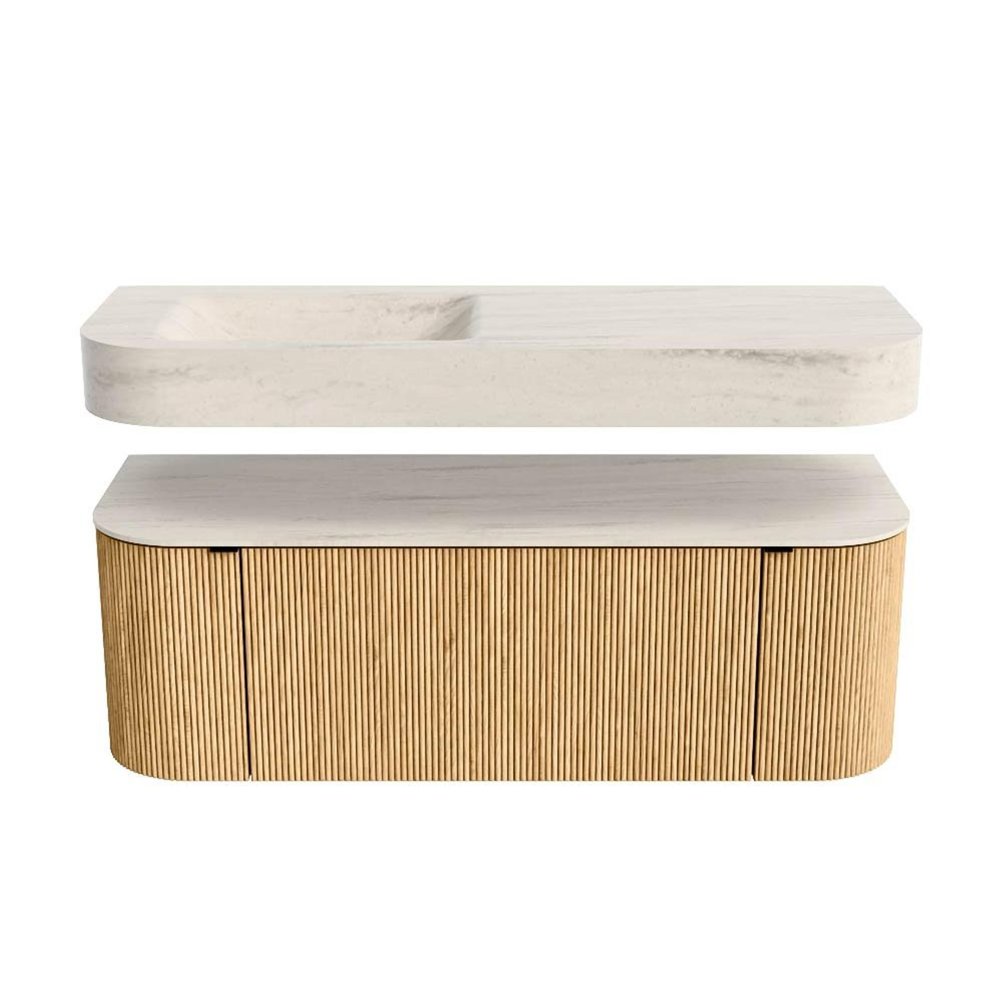 Boven het meubel zweeft een bijpassende, vrij hangende wastafel met afgeronde hoeken – perfect afgestemd op de vorm van de kast. De wastafel is uitgevoerd in Solid Surface en volgt subtiel de lijnen van het onderliggende meubel, waardoor een harmonieus geheel ontstaat. Het Solid Surface topblad vormt een sterke, onderhoudsvriendelijke basis en maakt de combinatie compleet.
