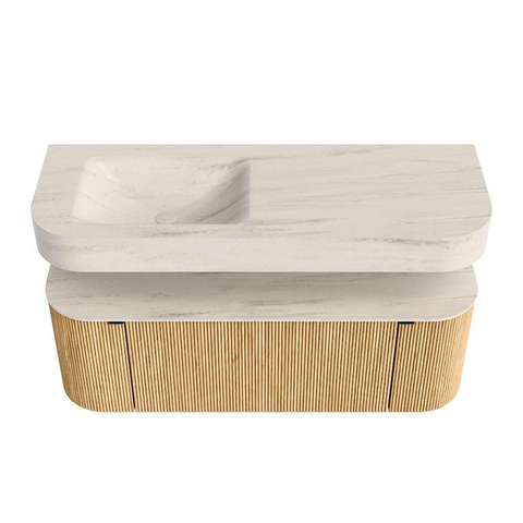 MONDIAZ THOR-DLUX 130cm badmeubel ronding links + rechts kleur Oak met 1 lade en 2 deuren. Vrijhangende wastafel CLOUD Links zonder kraangat kleur Meli.
