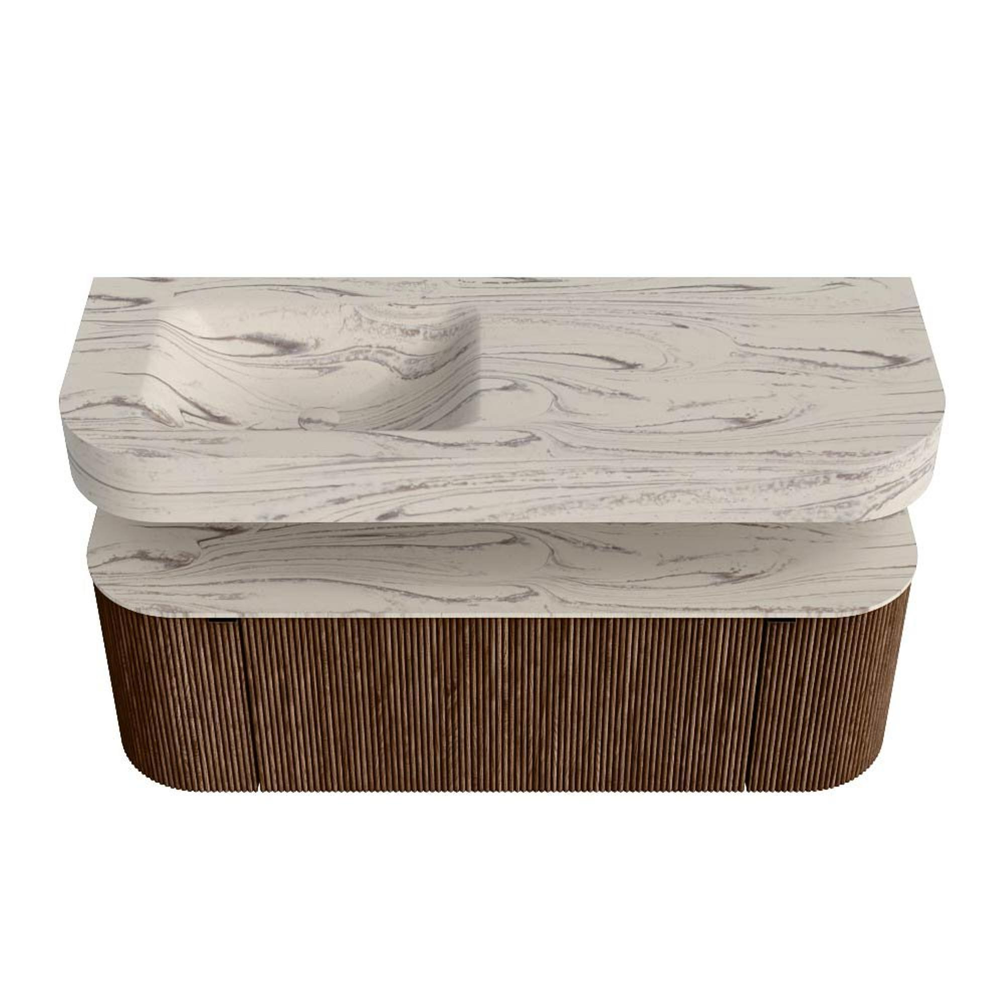 MONDIAZ THOR-DLUX 130cm badmeubel ronding links + rechts kleur Walnut met 1 lade en 2 deuren. Vrijhangende wastafel CLOUD Links zonder kraangat kleur Nata.