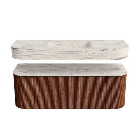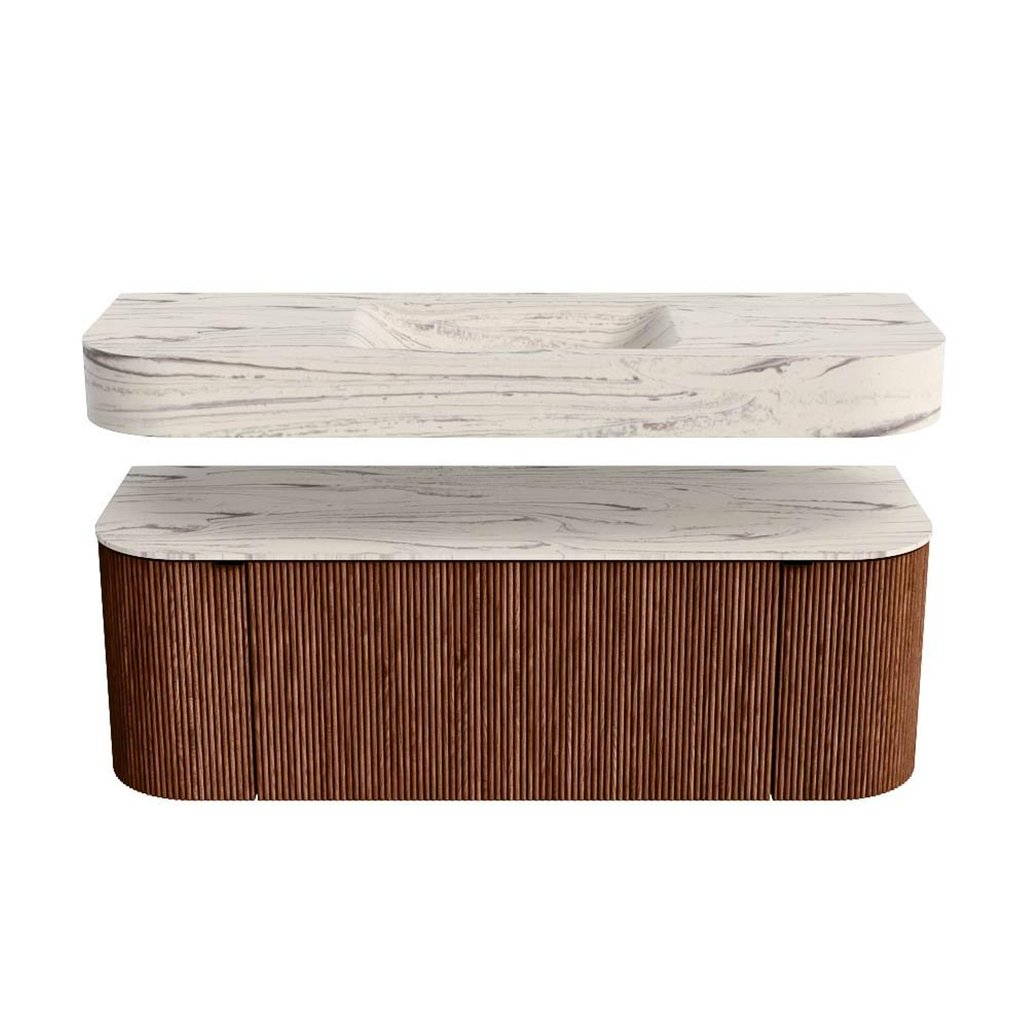 Boven het meubel zweeft een bijpassende, vrij hangende wastafel met afgeronde hoeken – perfect afgestemd op de vorm van de kast. De wastafel is uitgevoerd in Solid Surface en volgt subtiel de lijnen van het onderliggende meubel, waardoor een harmonieus geheel ontstaat. Het Solid Surface topblad vormt een sterke, onderhoudsvriendelijke basis en maakt de combinatie compleet.