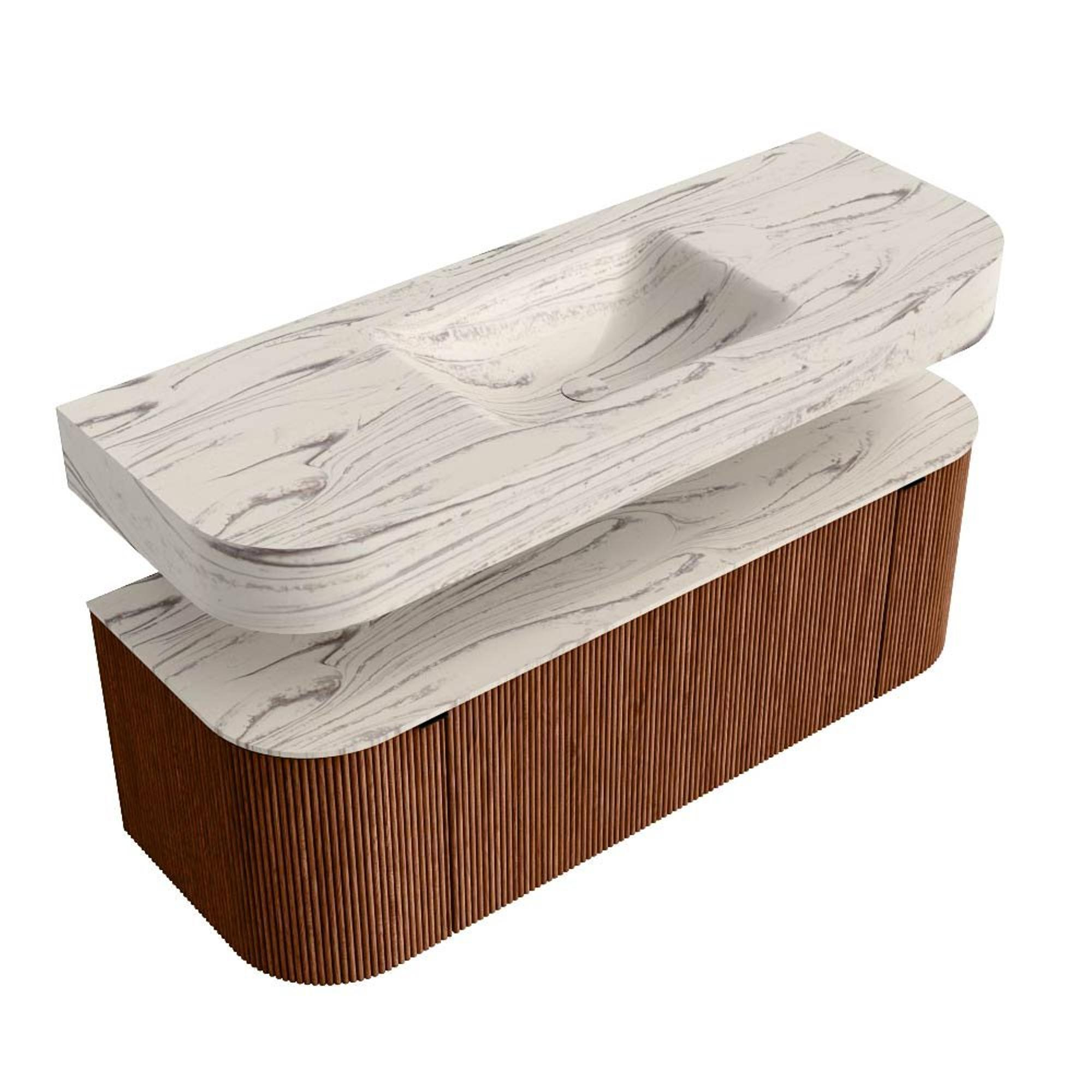 MONDIAZ THOR-DLUX 130cm badmeubel ronding links + rechts kleur Ruby met 1 lade en 2 deuren. Vrijhangende wastafel CLOUD Midden 1 kraangat kleur Nata.