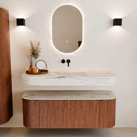 Natuurlijke materialen in warme tinten. De verticale ribbels brengen ritme en textuur in het ontwerp, terwijl het eikenhout zorgt voor een warme, ambachtelijke uitstraling. Kies uit 5 houttinten OAK, WALNUT, DUSK, SHADOW en RUBY zorgvuldig geselecteerde houtkleuren om zowel moderne als klassieke badkamers te verrijken.