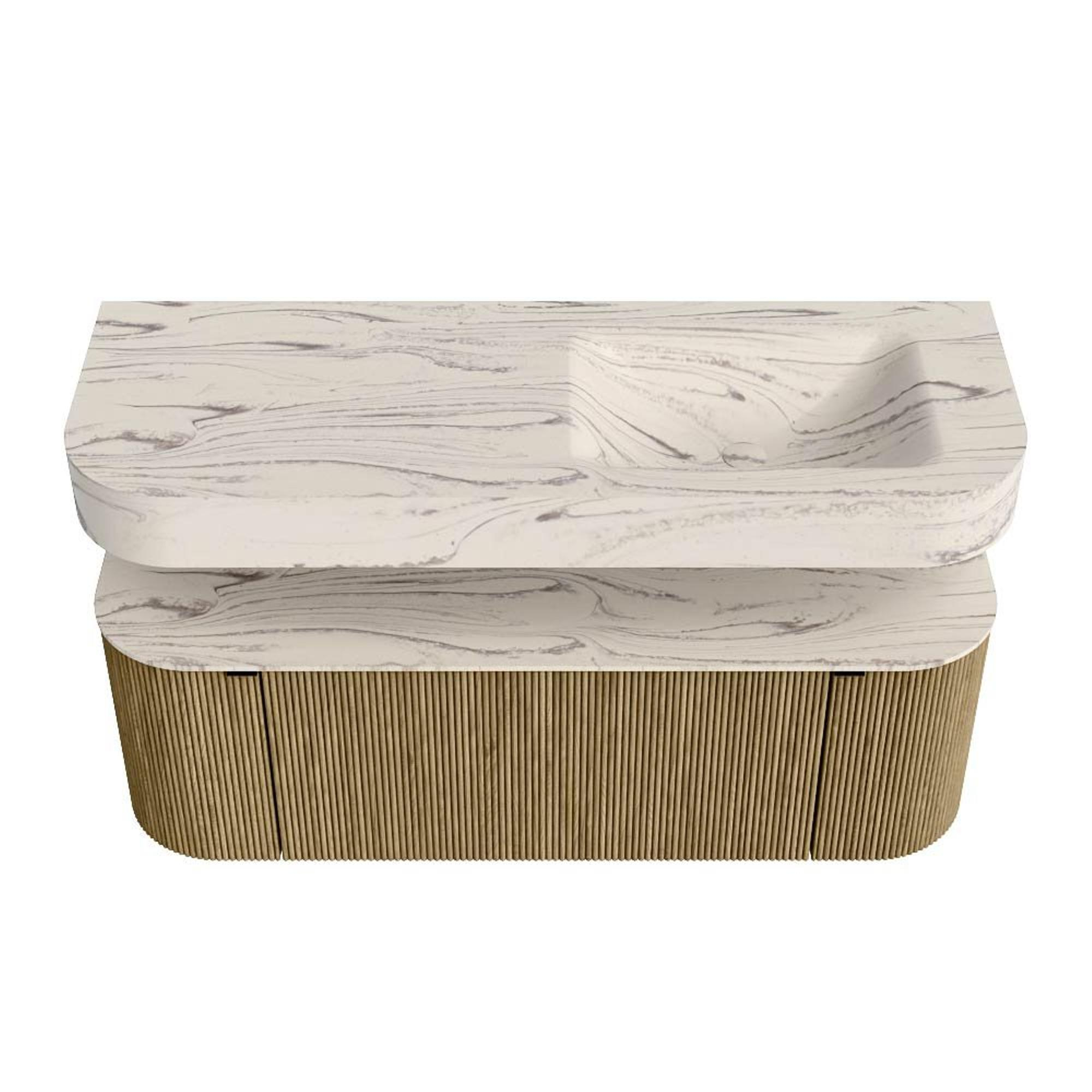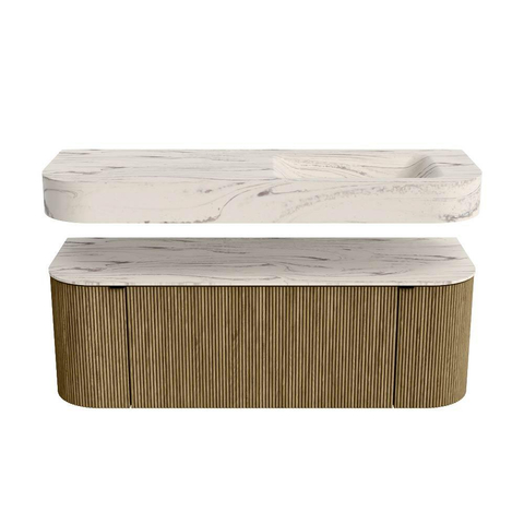 MONDIAZ THOR-DLUX 130cm badmeubel ronding links + rechts kleur Dusk met 1 lade en 2 deuren. Vrijhangende wastafel CLOUD Rechts 1 kraangat kleur Nata.