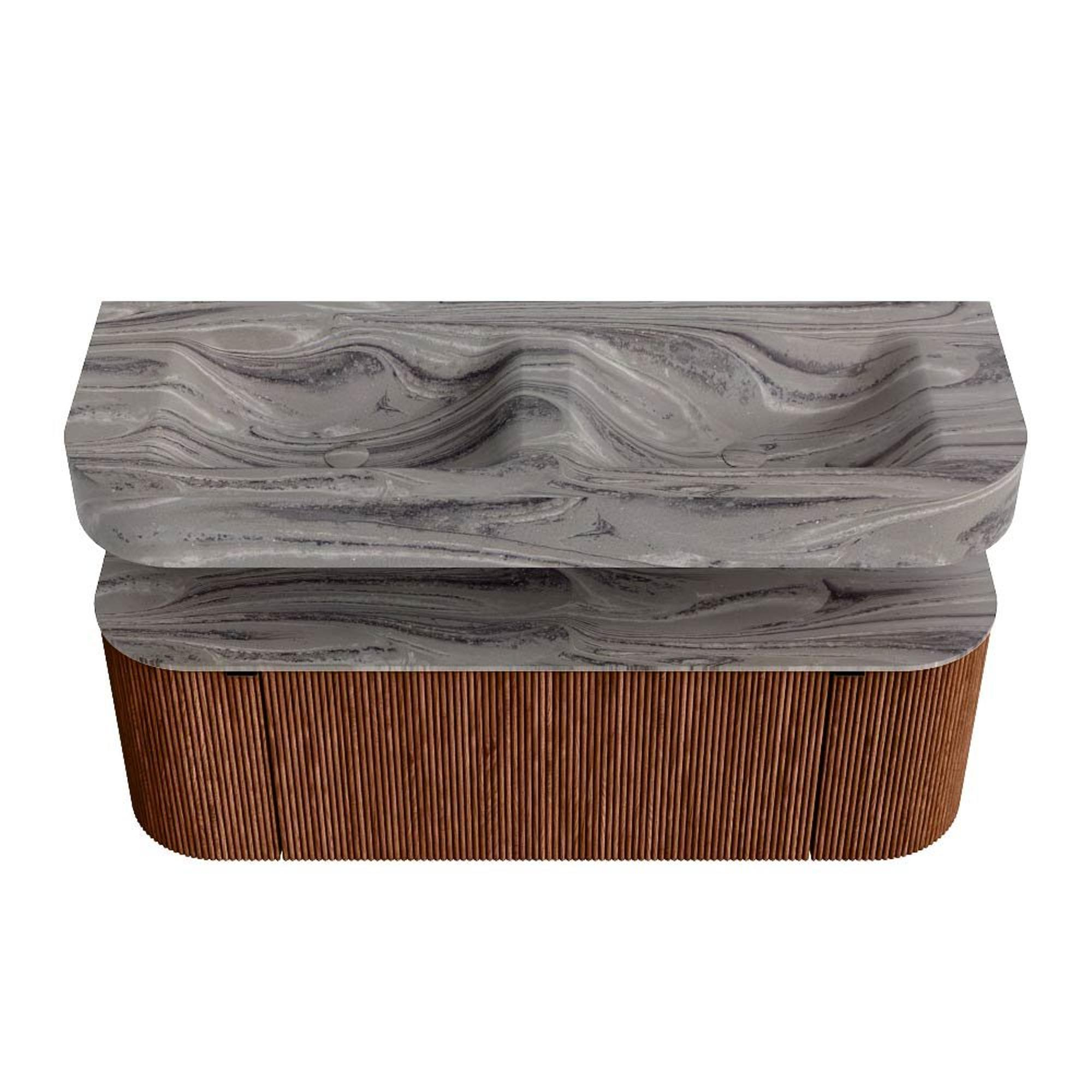 MONDIAZ THOR-DLUX 130cm badmeubel ronding links + rechts kleur Ruby met 1 lade en 2 deuren. Vrijhangende wastafel CLOUD Dubbel 2 kraangaten kleur Sombra.