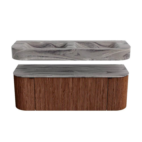 Boven het meubel zweeft een bijpassende, vrij hangende wastafel met afgeronde hoeken – perfect afgestemd op de vorm van de kast. De wastafel is uitgevoerd in Solid Surface en volgt subtiel de lijnen van het onderliggende meubel, waardoor een harmonieus geheel ontstaat. Het Solid Surface topblad vormt een sterke, onderhoudsvriendelijke basis en maakt de combinatie compleet.