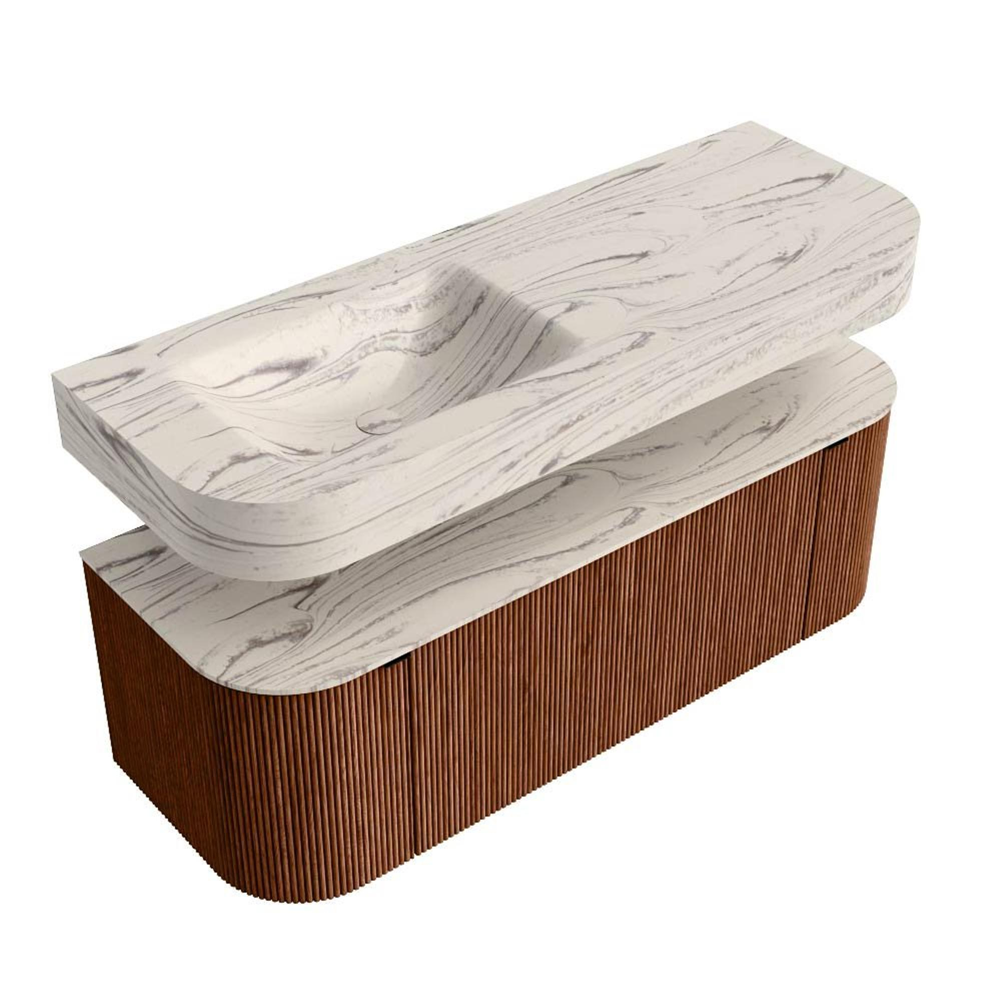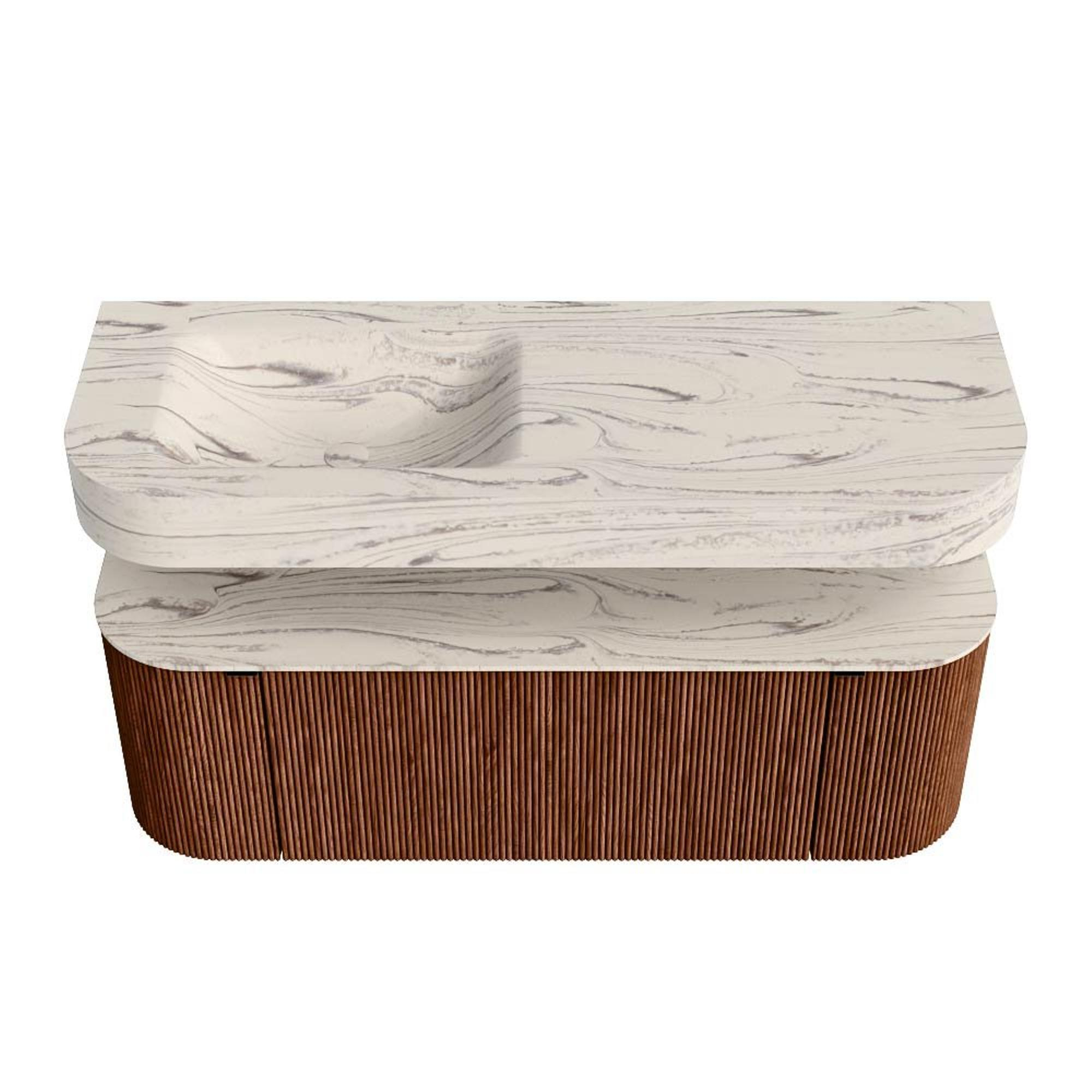 MONDIAZ THOR-DLUX 130cm badmeubel ronding links + rechts kleur Ruby met 1 lade en 2 deuren. Vrijhangende wastafel CLOUD Links 1 kraangat kleur Nata.