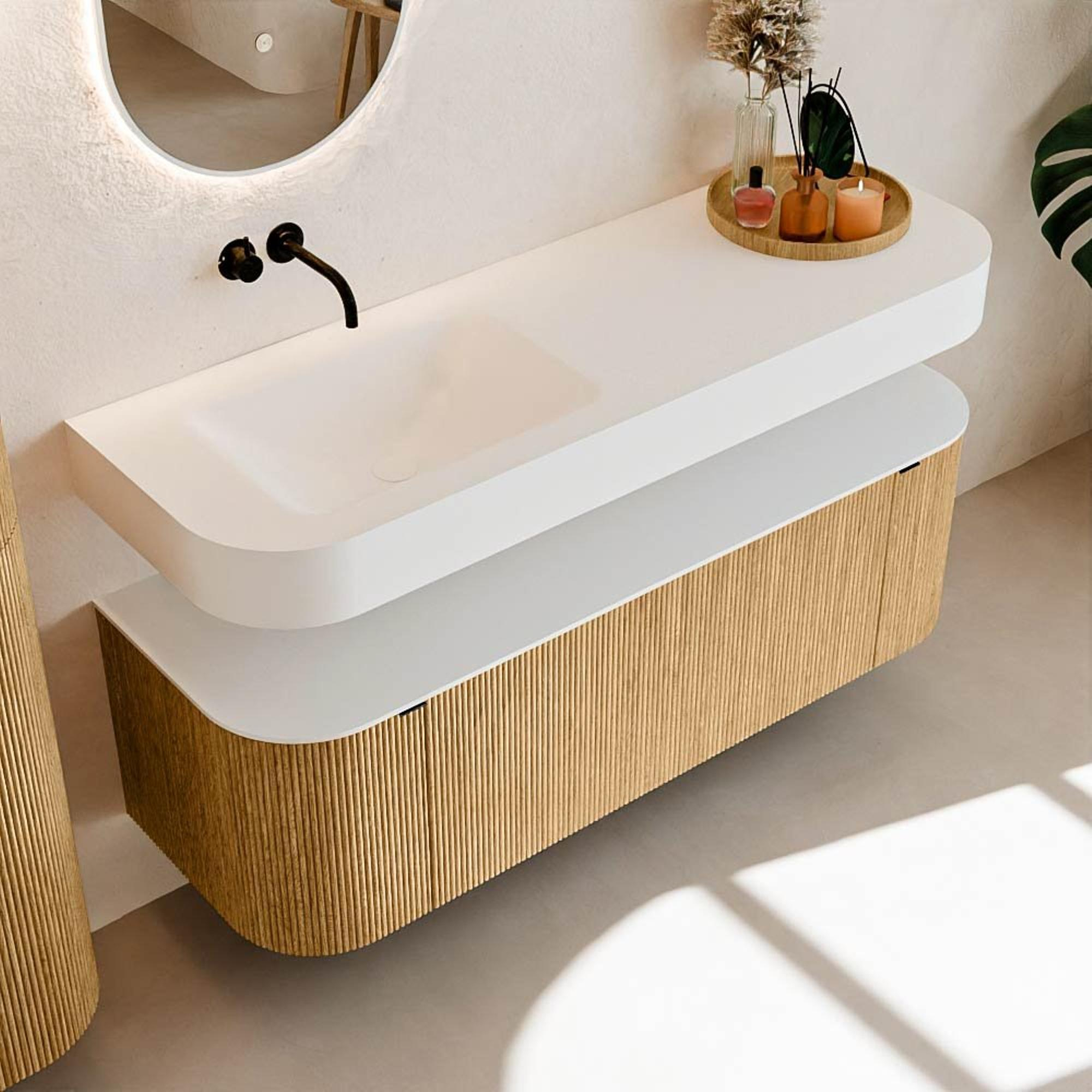 Boven het meubel zweeft een bijpassende, vrij hangende wastafel met afgeronde hoeken – perfect afgestemd op de vorm van de kast. De wastafel is uitgevoerd in Solid Surface en volgt subtiel de lijnen van het onderliggende meubel, waardoor een harmonieus geheel ontstaat. Het Solid Surface topblad vormt een sterke, onderhoudsvriendelijke basis en maakt de combinatie compleet.