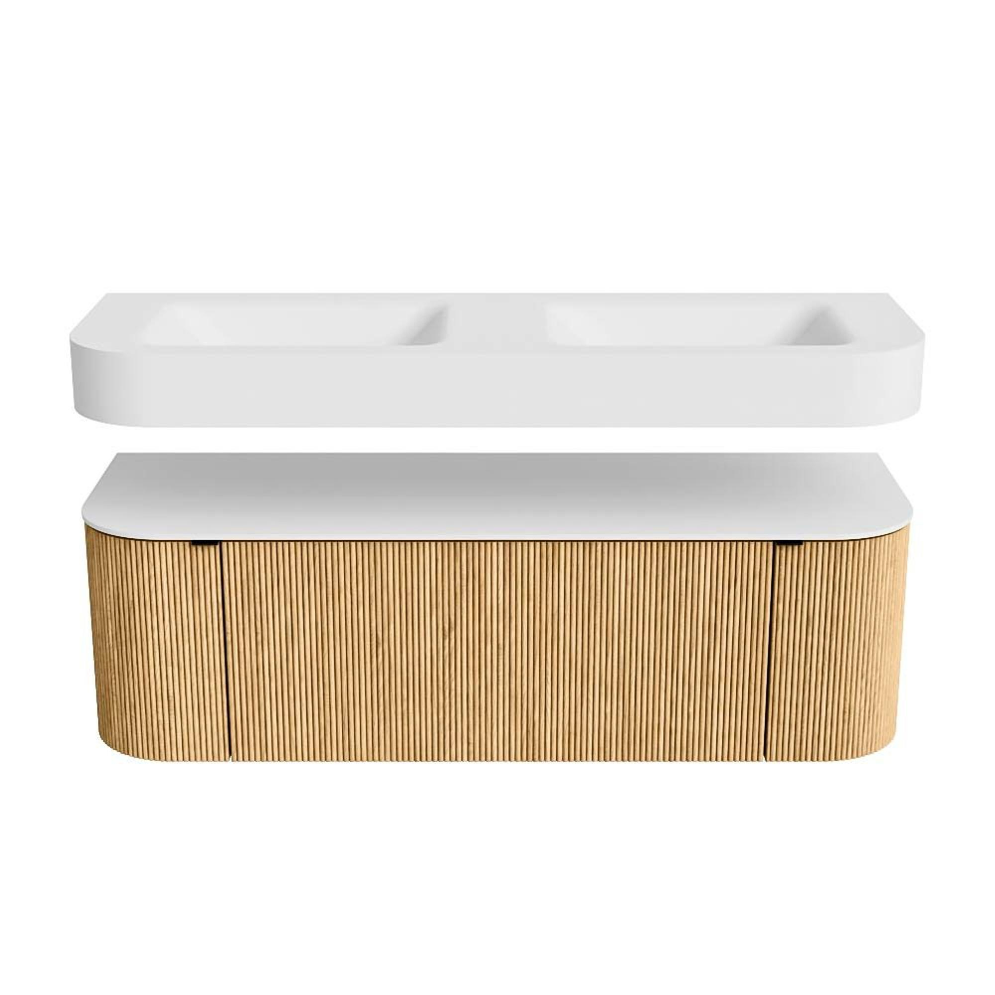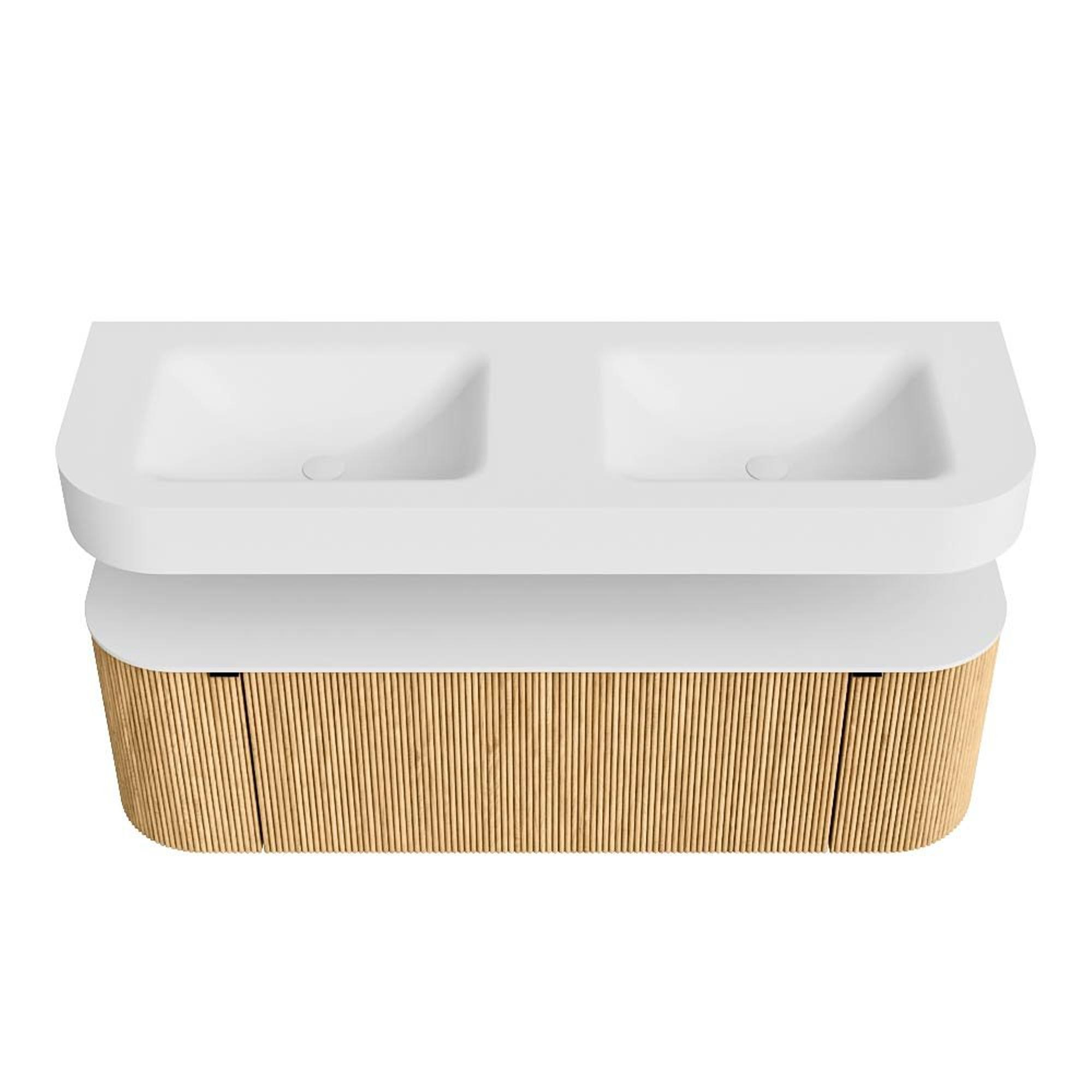 Boven het meubel zweeft een bijpassende, vrij hangende wastafel met afgeronde hoeken – perfect afgestemd op de vorm van de kast. De wastafel is uitgevoerd in Solid Surface en volgt subtiel de lijnen van het onderliggende meubel, waardoor een harmonieus geheel ontstaat. Het Solid Surface topblad vormt een sterke, onderhoudsvriendelijke basis en maakt de combinatie compleet.