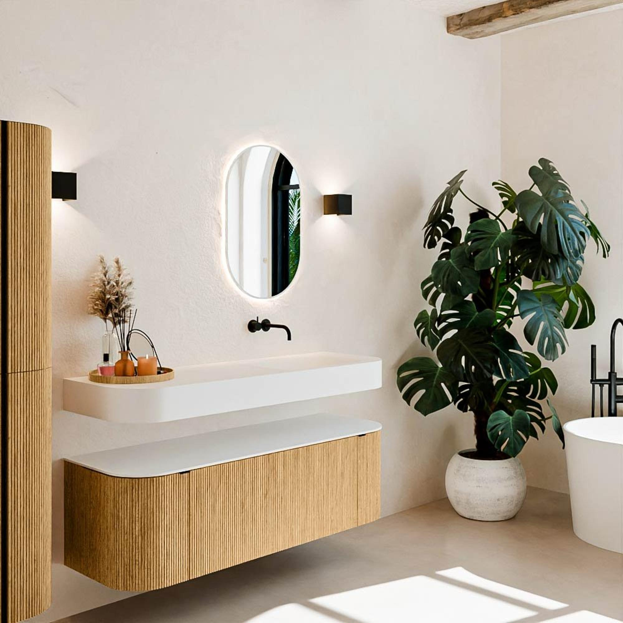 Natuurlijke materialen in warme tinten. De verticale ribbels brengen ritme en textuur in het ontwerp, terwijl het eikenhout zorgt voor een warme, ambachtelijke uitstraling. Kies uit 5 houttinten OAK, WALNUT, DUSK, SHADOW en RUBY zorgvuldig geselecteerde houtkleuren om zowel moderne als klassieke badkamers te verrijken.
