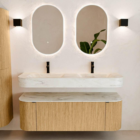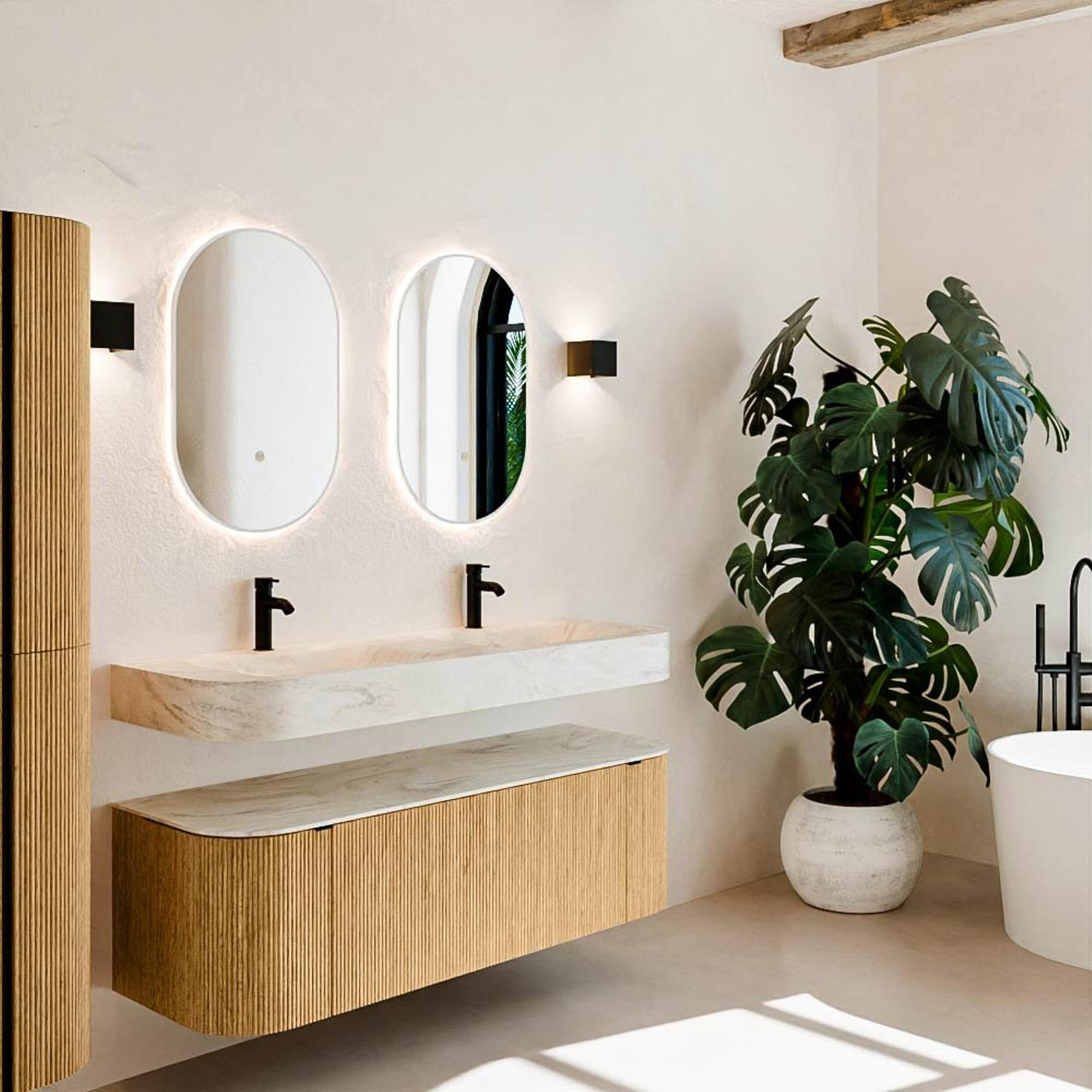 Natuurlijke materialen in warme tinten. De verticale ribbels brengen ritme en textuur in het ontwerp, terwijl het eikenhout zorgt voor een warme, ambachtelijke uitstraling. Kies uit 5 houttinten OAK, WALNUT, DUSK, SHADOW en RUBY zorgvuldig geselecteerde houtkleuren om zowel moderne als klassieke badkamers te verrijken.