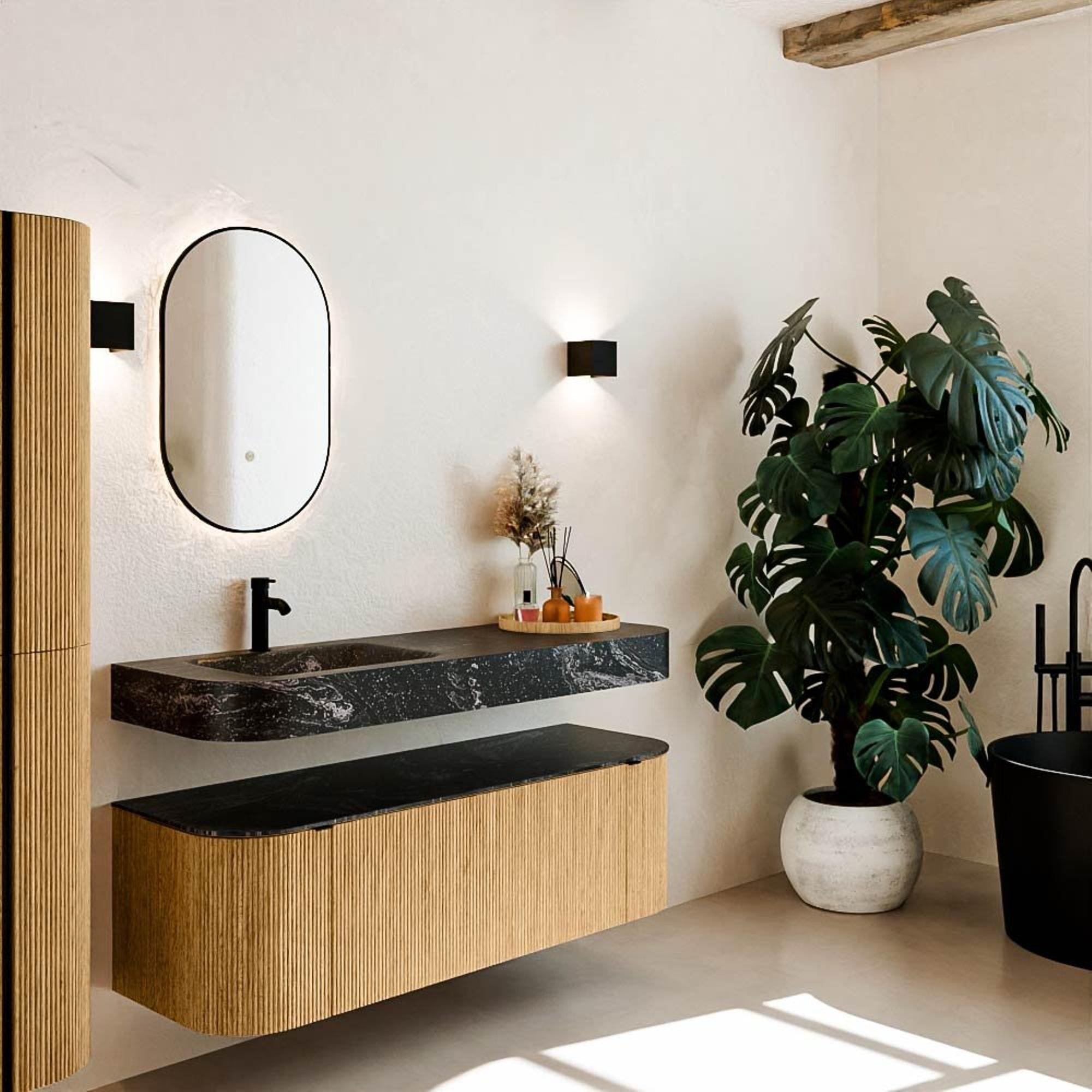 Natuurlijke materialen in warme tinten. De verticale ribbels brengen ritme en textuur in het ontwerp, terwijl het eikenhout zorgt voor een warme, ambachtelijke uitstraling. Kies uit 5 houttinten OAK, WALNUT, DUSK, SHADOW en RUBY zorgvuldig geselecteerde houtkleuren om zowel moderne als klassieke badkamers te verrijken.