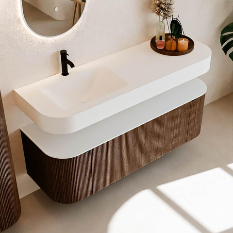 Boven het meubel zweeft een bijpassende, vrij hangende wastafel met afgeronde hoeken – perfect afgestemd op de vorm van de kast. De wastafel is uitgevoerd in Solid Surface en volgt subtiel de lijnen van het onderliggende meubel, waardoor een harmonieus geheel ontstaat. Het Solid Surface topblad vormt een sterke, onderhoudsvriendelijke basis en maakt de combinatie compleet.