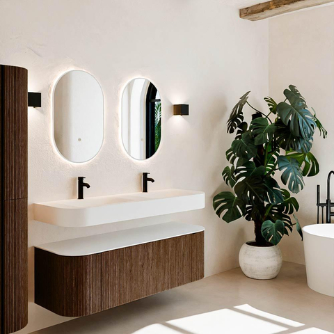 Natuurlijke materialen in warme tinten. De verticale ribbels brengen ritme en textuur in het ontwerp, terwijl het eikenhout zorgt voor een warme, ambachtelijke uitstraling. Kies uit 5 houttinten OAK, WALNUT, DUSK, SHADOW en RUBY zorgvuldig geselecteerde houtkleuren om zowel moderne als klassieke badkamers te verrijken.