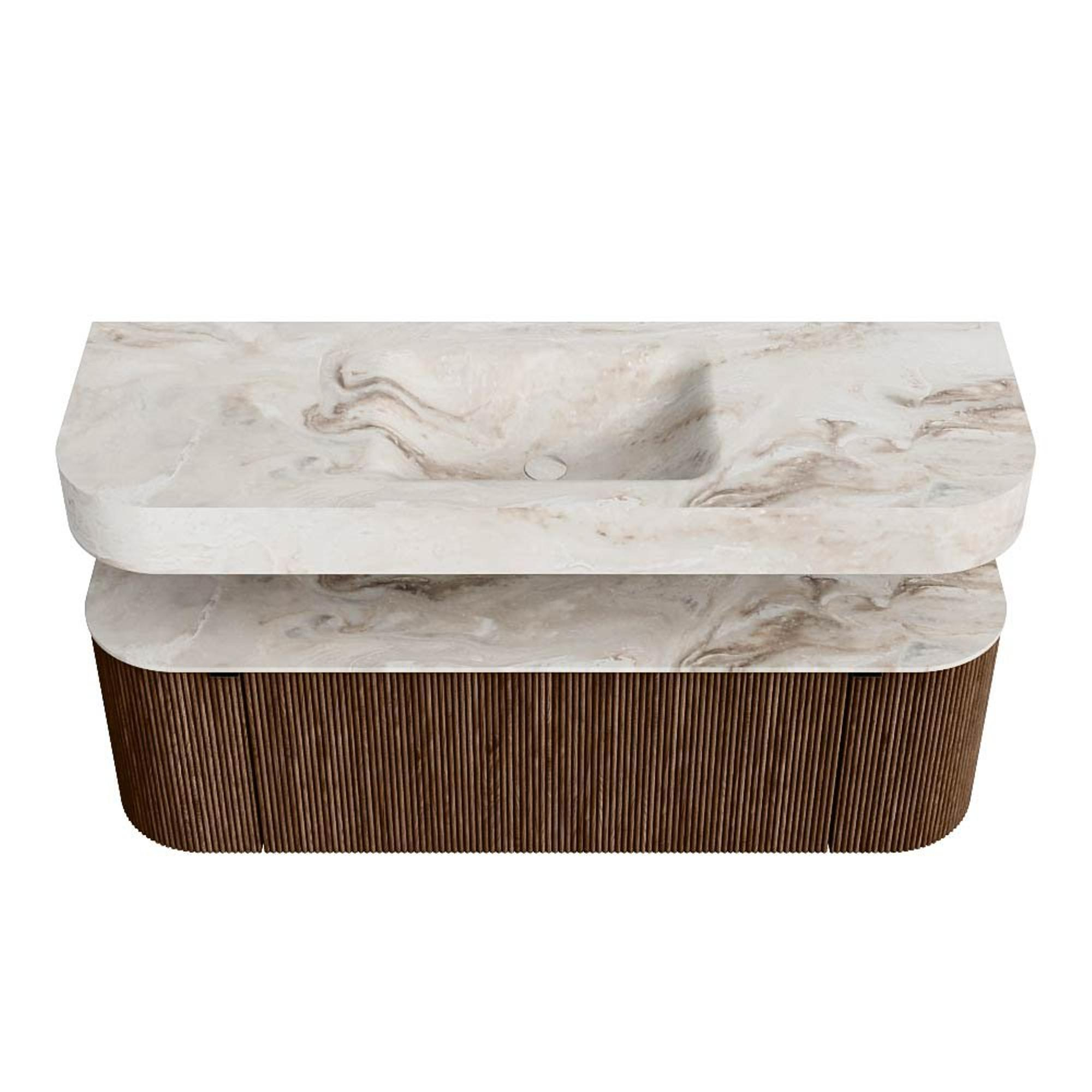 MONDIAZ THOR-DLUX 140cm badmeubel ronding links + rechts kleur Walnut met 1 lade en 2 deuren. Vrijhangende wastafel CLOUD Midden zonder kraangat kleur Frappe.