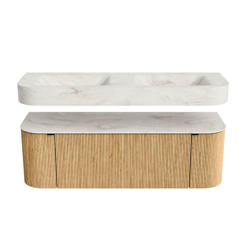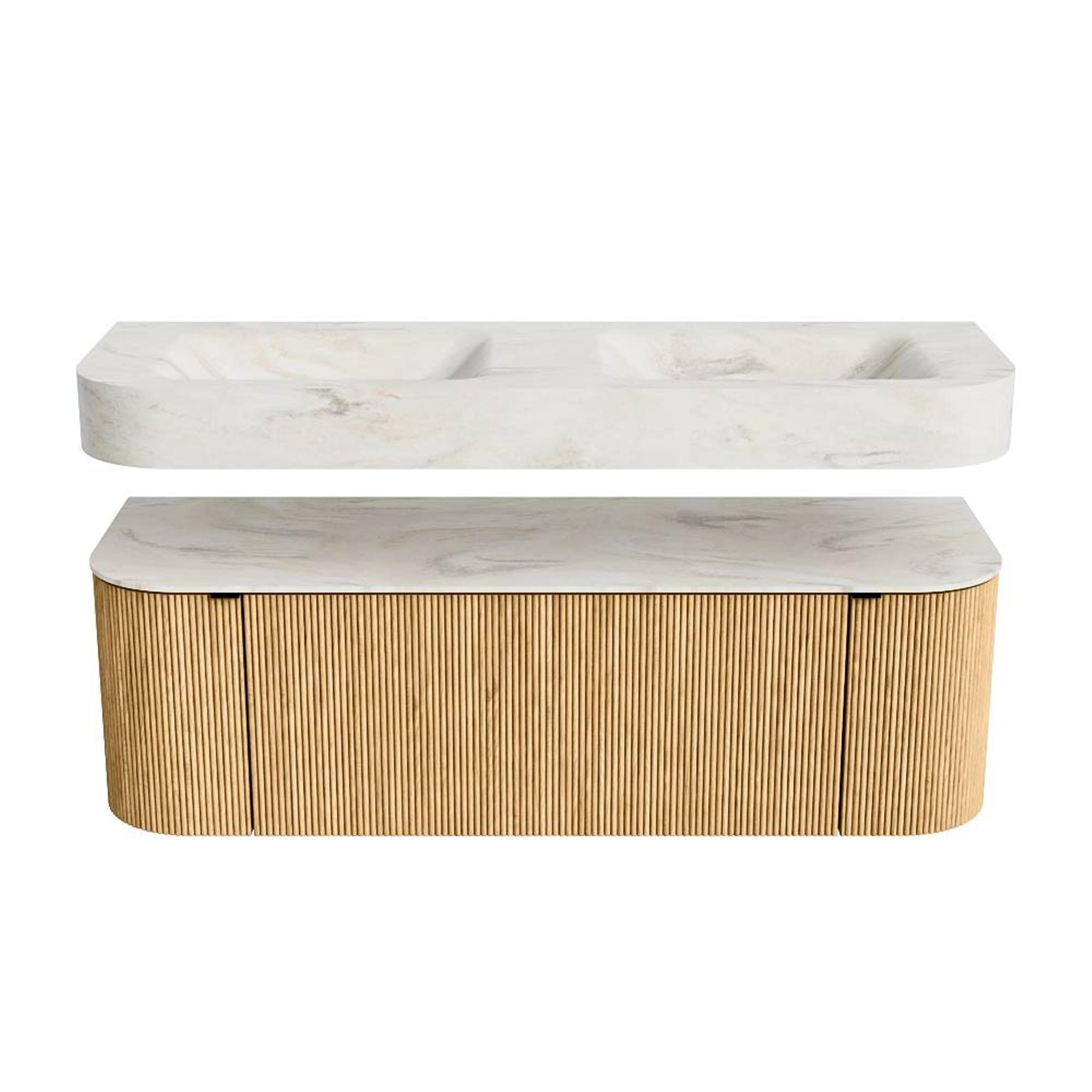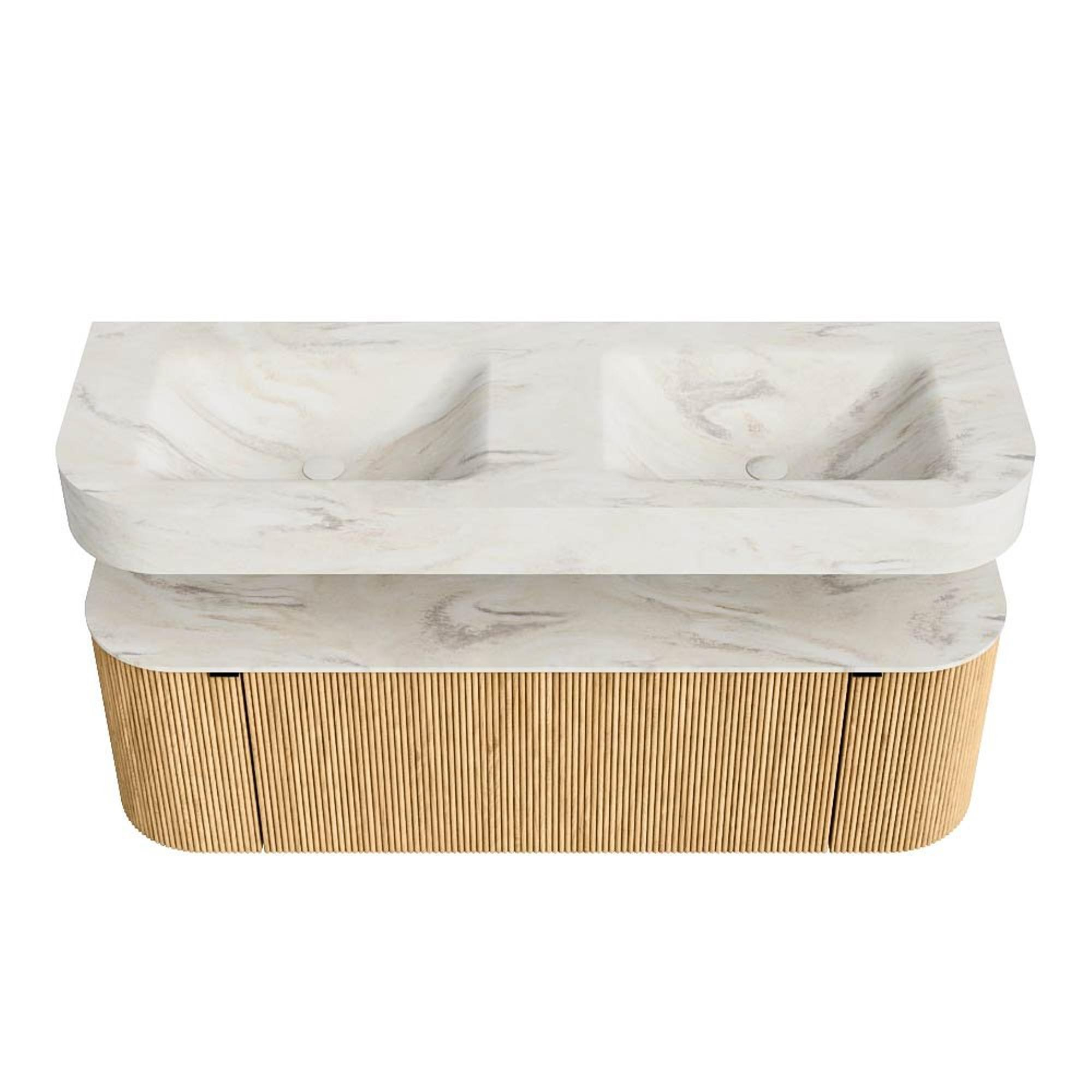 MONDIAZ THOR-DLUX 140cm badmeubel ronding links + rechts kleur Oak met 1 lade en 2 deuren. Vrijhangende wastafel CLOUD Dubbel zonder kraangat kleur Ostra.