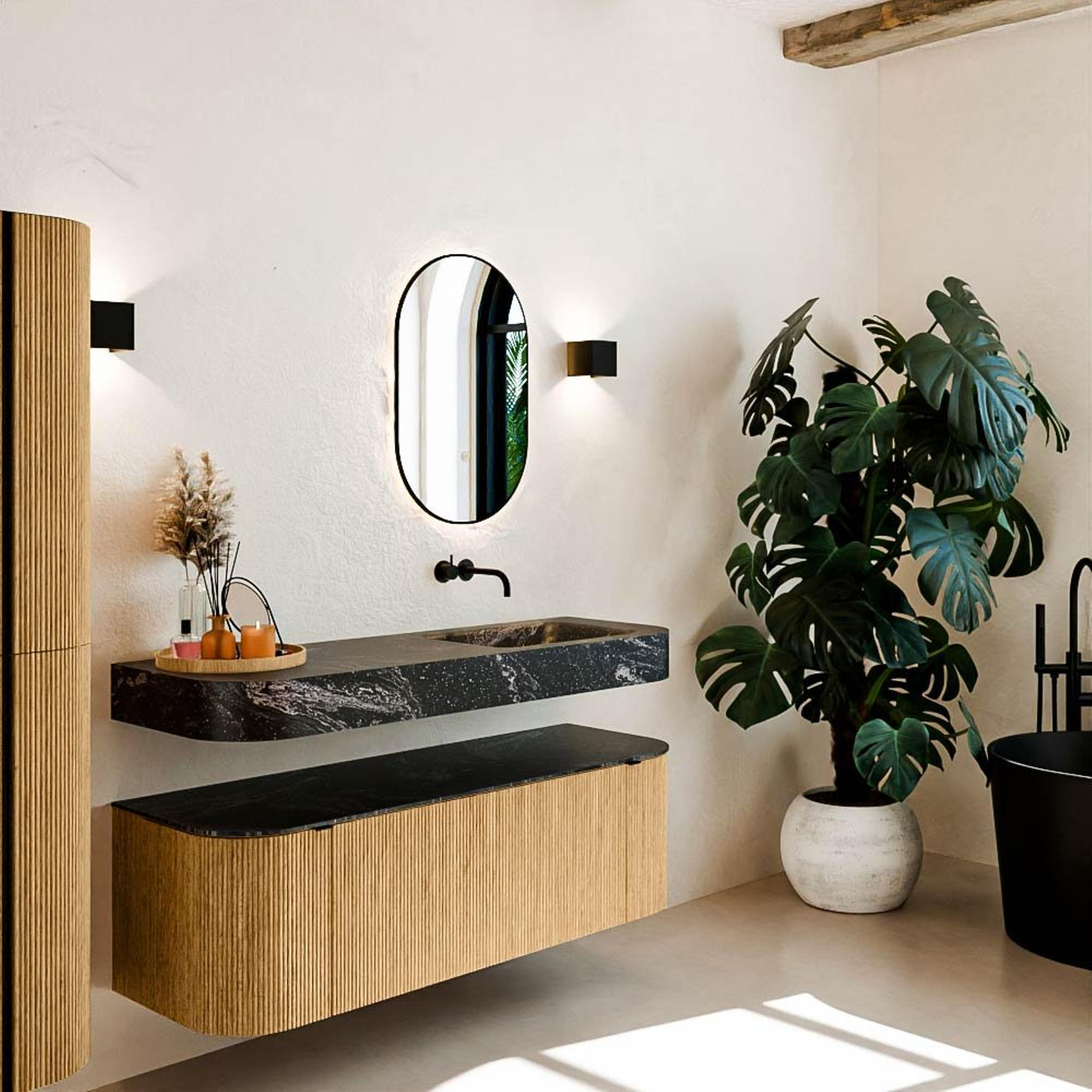 Natuurlijke materialen in warme tinten. De verticale ribbels brengen ritme en textuur in het ontwerp, terwijl het eikenhout zorgt voor een warme, ambachtelijke uitstraling. Kies uit 5 houttinten OAK, WALNUT, DUSK, SHADOW en RUBY zorgvuldig geselecteerde houtkleuren om zowel moderne als klassieke badkamers te verrijken.