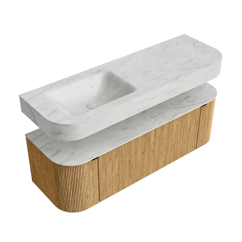 MONDIAZ THOR-DLUX 140cm badmeubel ronding links + rechts kleur Oak met 1 lade en 2 deuren. Vrijhangende wastafel CLOUD Links 1 kraangat kleur Opalo.