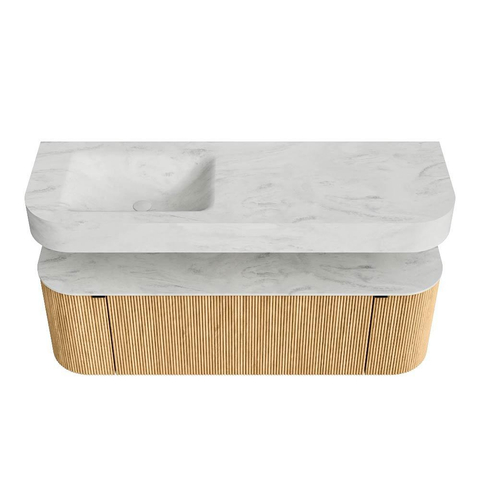 Boven het meubel zweeft een bijpassende, vrij hangende wastafel met afgeronde hoeken – perfect afgestemd op de vorm van de kast. De wastafel is uitgevoerd in Solid Surface en volgt subtiel de lijnen van het onderliggende meubel, waardoor een harmonieus geheel ontstaat. Het Solid Surface topblad vormt een sterke, onderhoudsvriendelijke basis en maakt de combinatie compleet.