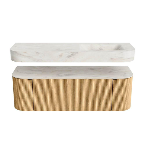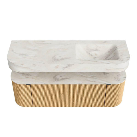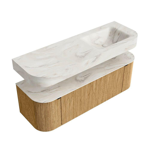 MONDIAZ THOR-DLUX 140cm badmeubel ronding links + rechts kleur Oak met 1 lade en 2 deuren. Vrijhangende wastafel CLOUD Rechts 1 kraangat kleur Ostra.