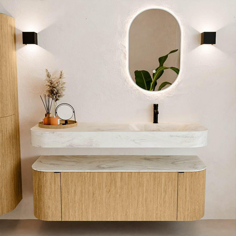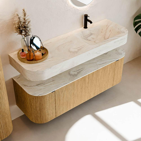 Boven het meubel zweeft een bijpassende, vrij hangende wastafel met afgeronde hoeken – perfect afgestemd op de vorm van de kast. De wastafel is uitgevoerd in Solid Surface en volgt subtiel de lijnen van het onderliggende meubel, waardoor een harmonieus geheel ontstaat. Het Solid Surface topblad vormt een sterke, onderhoudsvriendelijke basis en maakt de combinatie compleet.