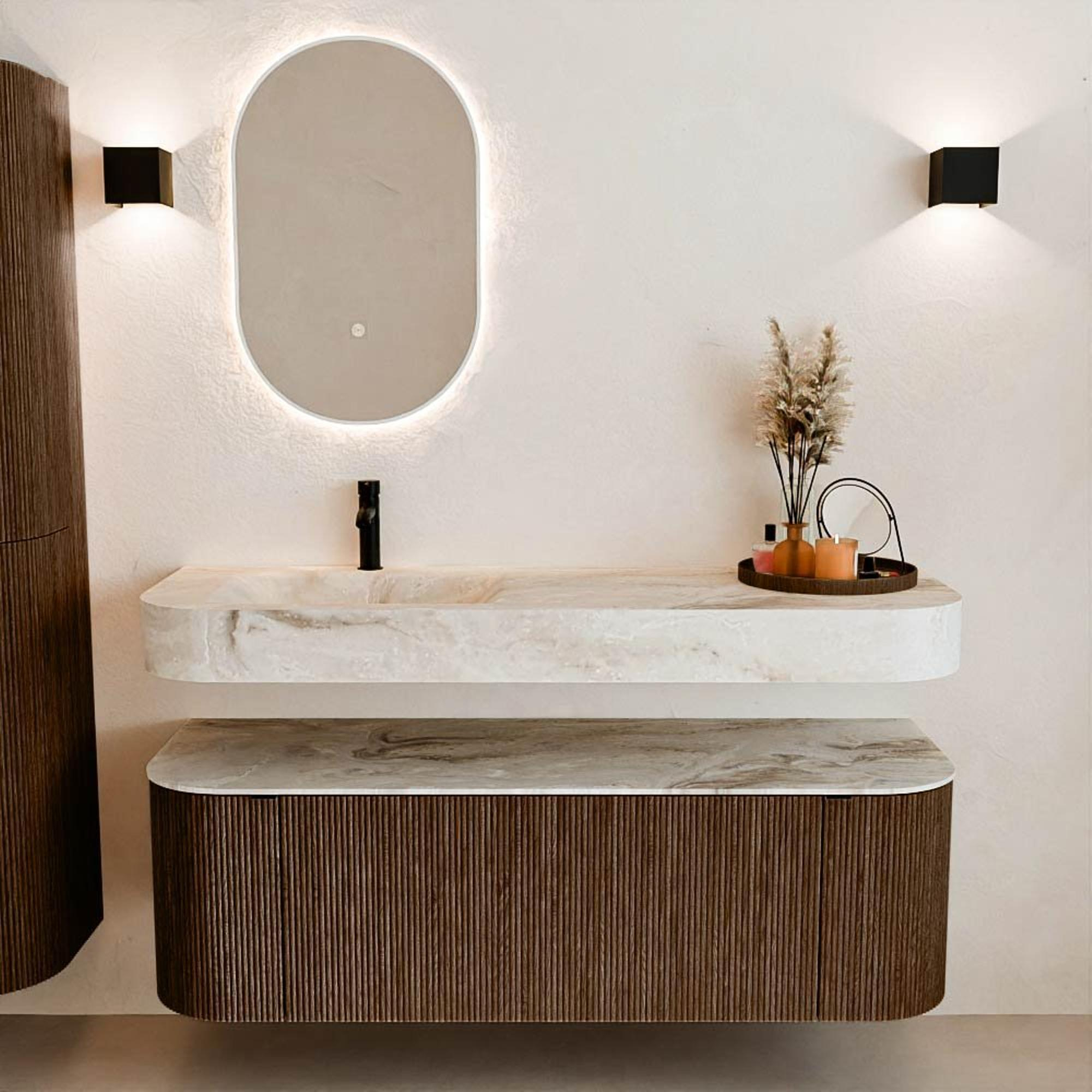 Natuurlijke materialen in warme tinten. De verticale ribbels brengen ritme en textuur in het ontwerp, terwijl het eikenhout zorgt voor een warme, ambachtelijke uitstraling. Kies uit 5 houttinten OAK, WALNUT, DUSK, SHADOW en RUBY zorgvuldig geselecteerde houtkleuren om zowel moderne als klassieke badkamers te verrijken.