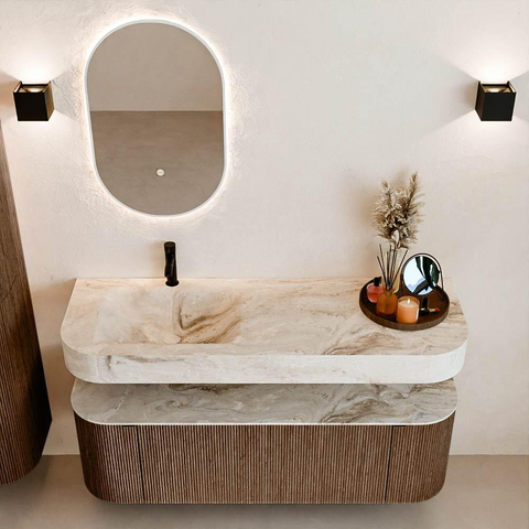 MONDIAZ THOR-DLUX 140cm badmeubel ronding links + rechts kleur Walnut met 1 lade en 2 deuren. Vrijhangende wastafel CLOUD Links 1 kraangat kleur Frappe.