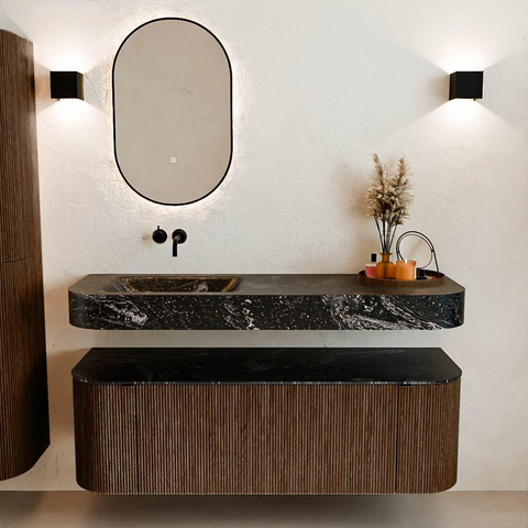 MONDIAZ THOR-DLUX 140cm badmeubel ronding links + rechts kleur Walnut met 1 lade en 2 deuren. Vrijhangende wastafel CLOUD Links zonder kraangat kleur Lava.