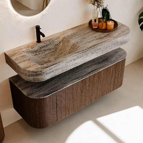 Natuurlijke materialen in warme tinten. De verticale ribbels brengen ritme en textuur in het ontwerp, terwijl het eikenhout zorgt voor een warme, ambachtelijke uitstraling. Kies uit 5 houttinten OAK, WALNUT, DUSK, SHADOW en RUBY zorgvuldig geselecteerde houtkleuren om zowel moderne als klassieke badkamers te verrijken.