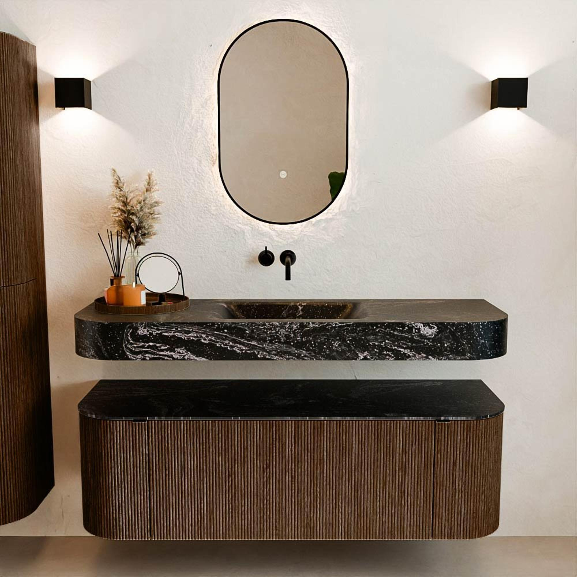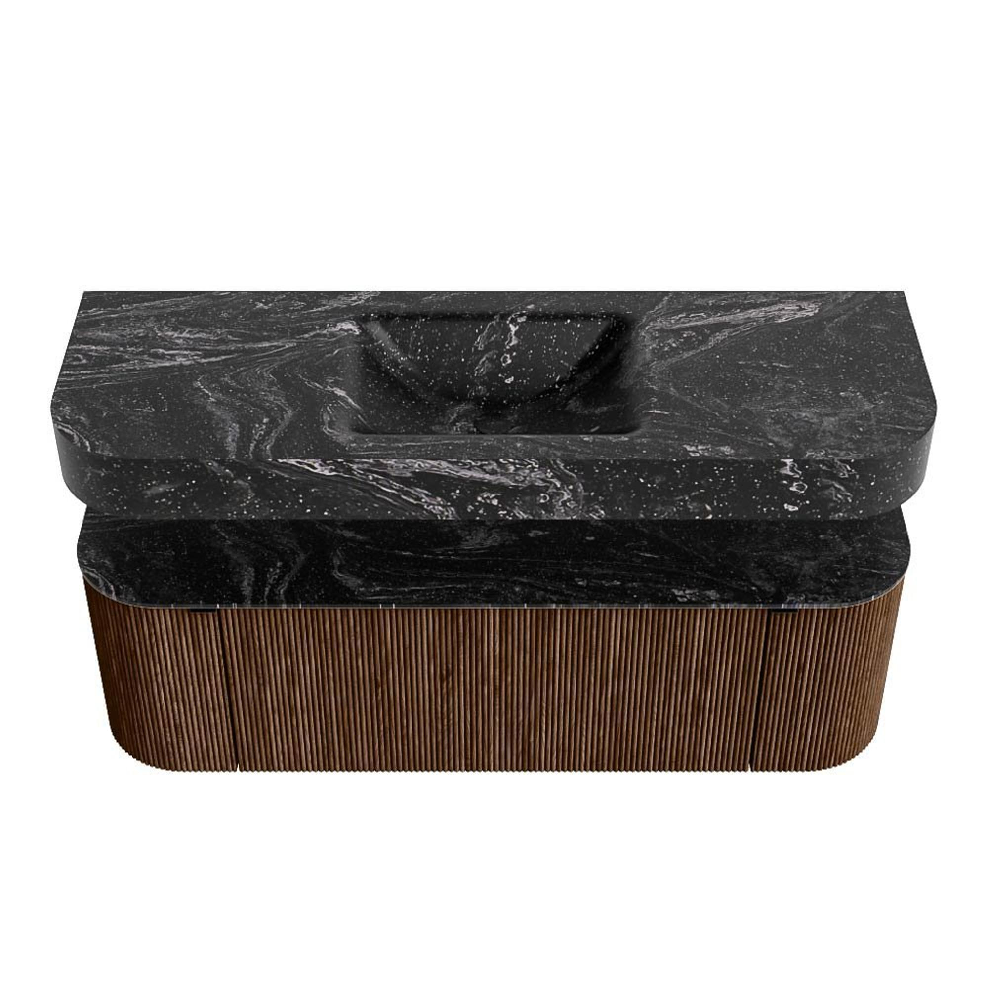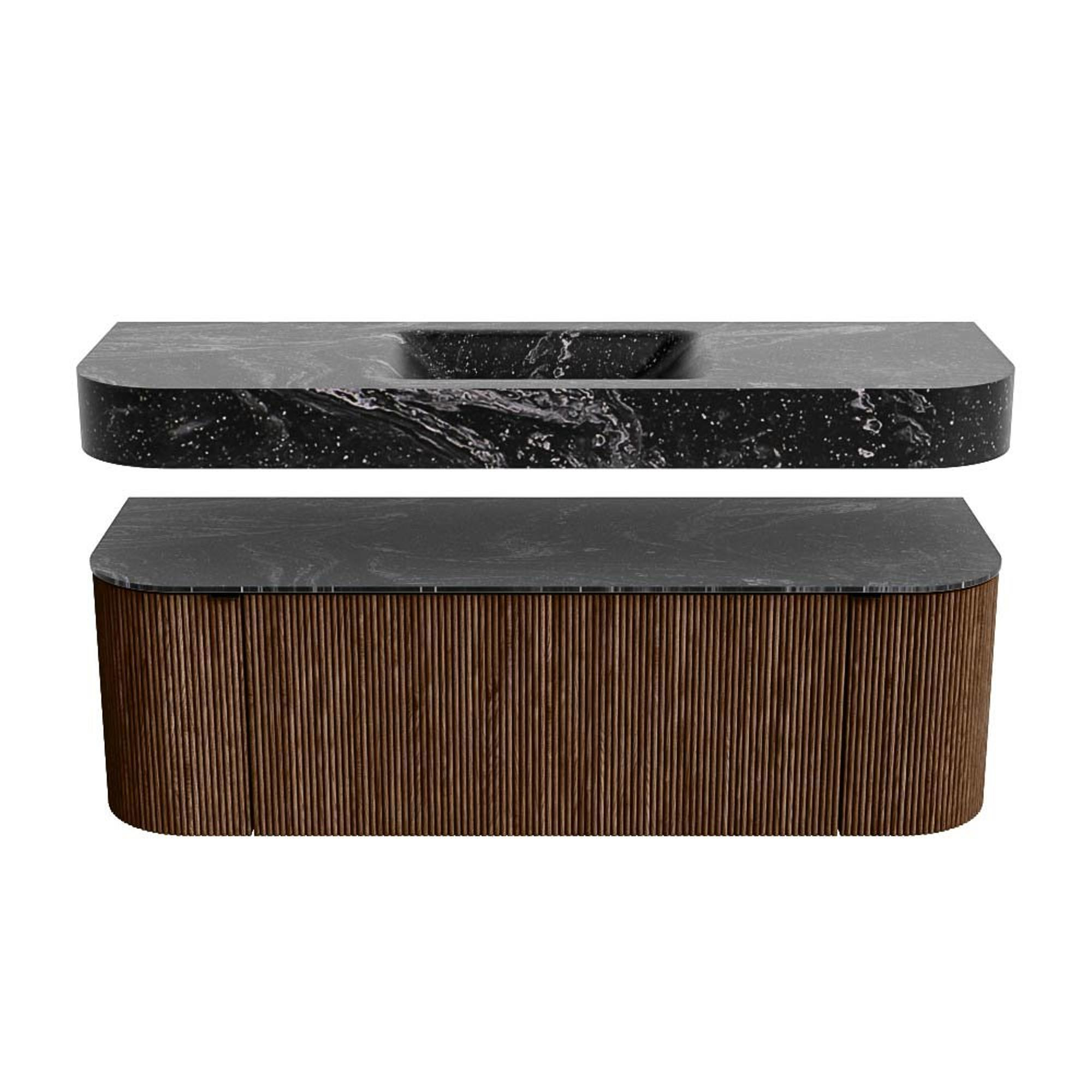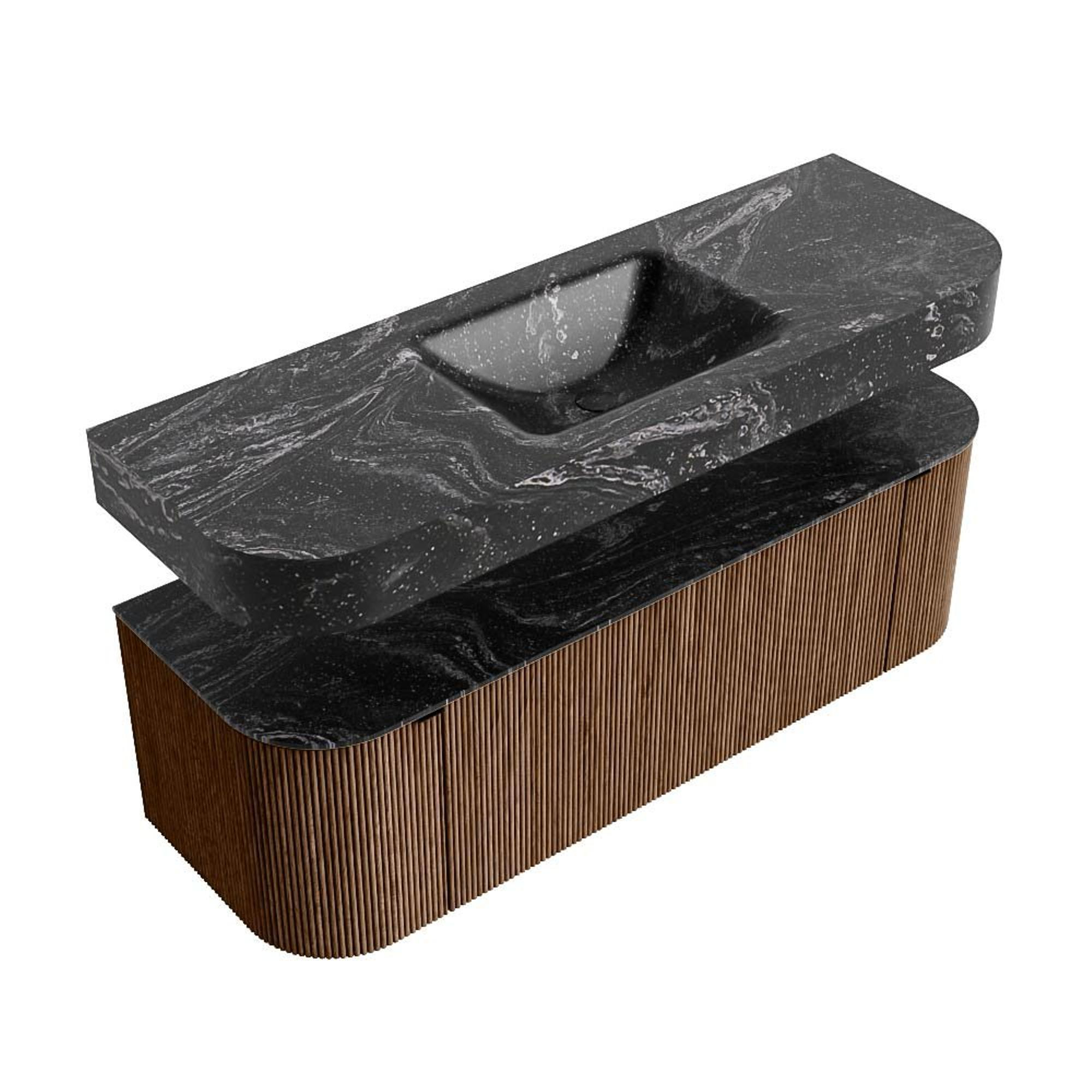 MONDIAZ THOR-DLUX 140cm badmeubel ronding links + rechts kleur Walnut met 1 lade en 2 deuren. Vrijhangende wastafel CLOUD Midden zonder kraangat kleur Lava.