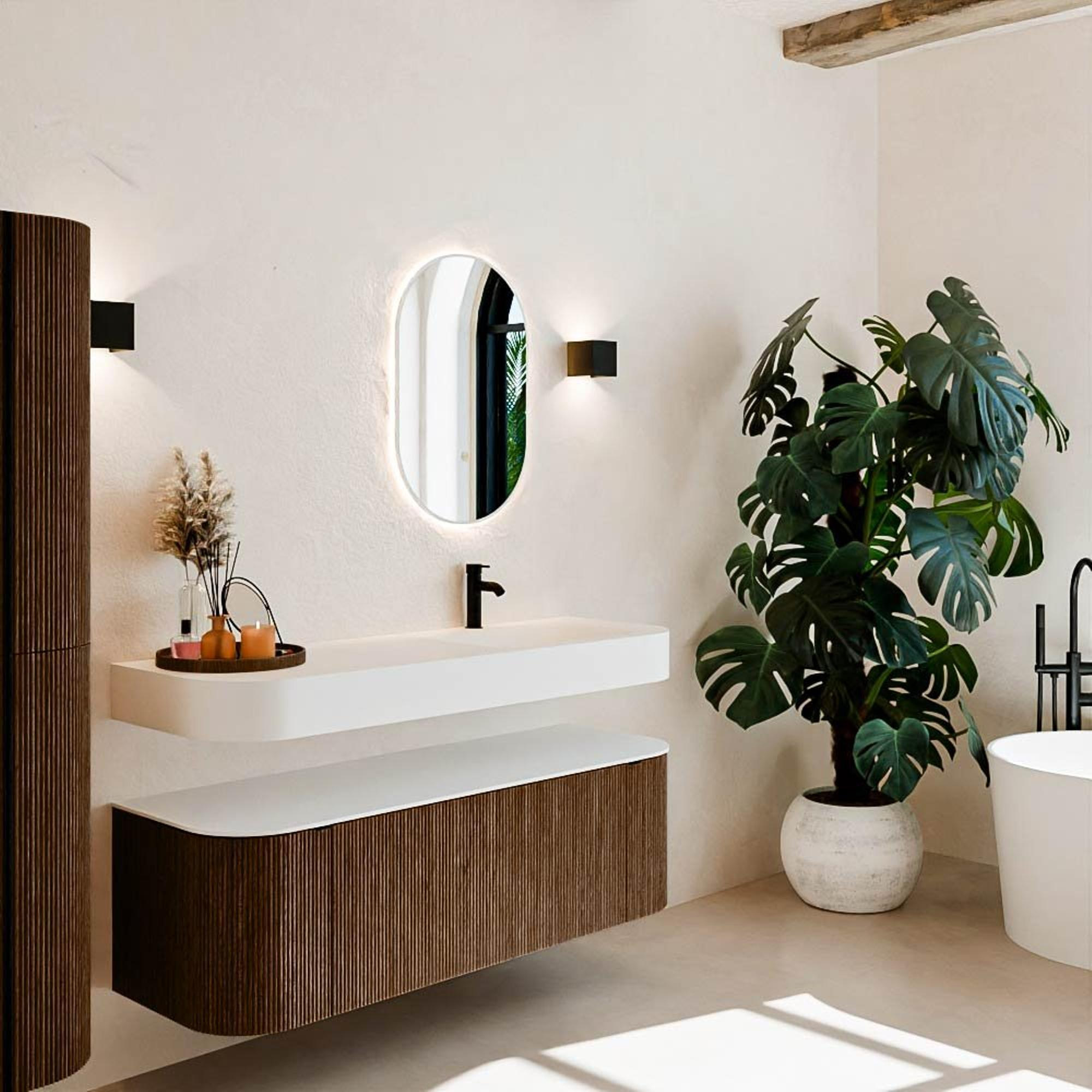Natuurlijke materialen in warme tinten. De verticale ribbels brengen ritme en textuur in het ontwerp, terwijl het eikenhout zorgt voor een warme, ambachtelijke uitstraling. Kies uit 5 houttinten OAK, WALNUT, DUSK, SHADOW en RUBY zorgvuldig geselecteerde houtkleuren om zowel moderne als klassieke badkamers te verrijken.