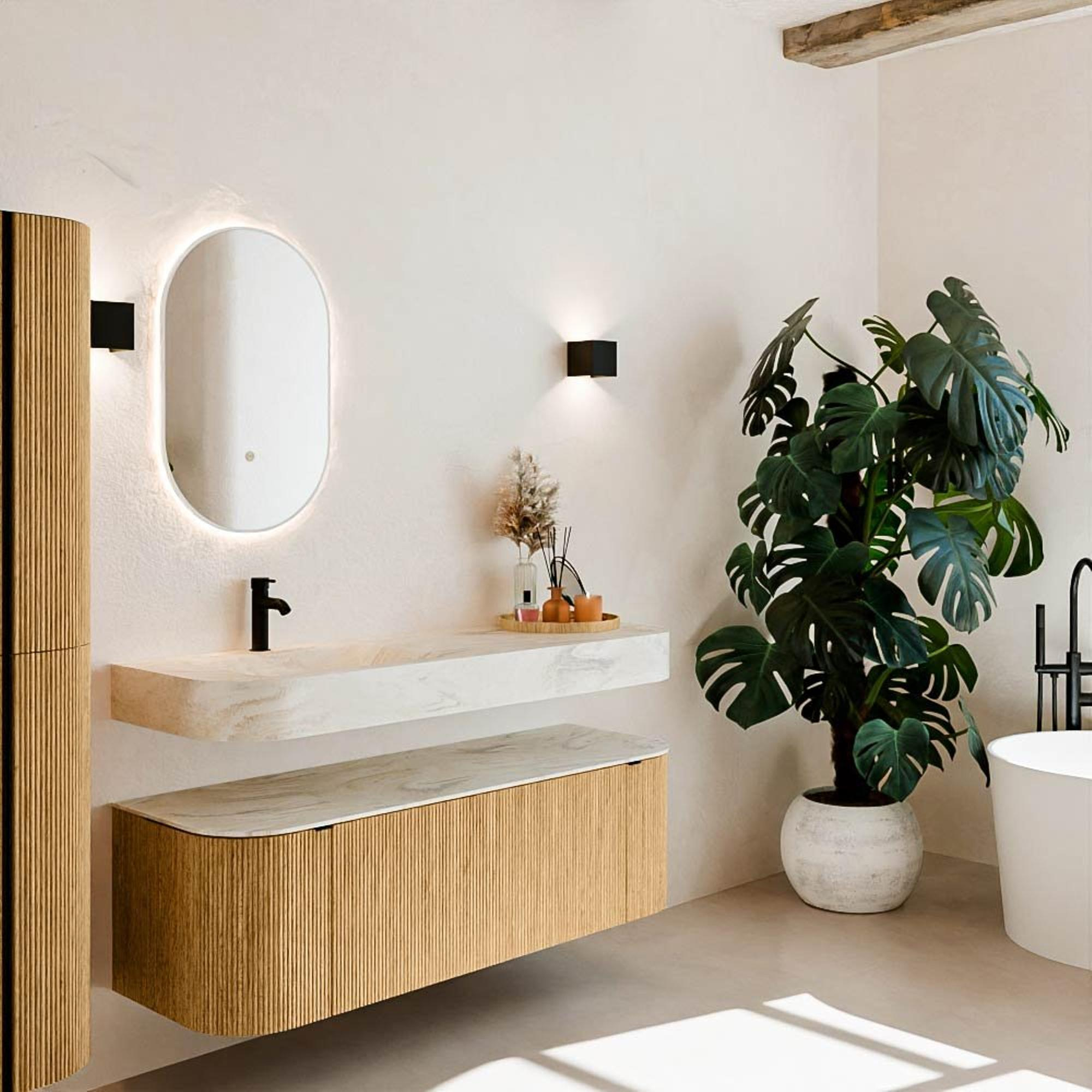 Natuurlijke materialen in warme tinten. De verticale ribbels brengen ritme en textuur in het ontwerp, terwijl het eikenhout zorgt voor een warme, ambachtelijke uitstraling. Kies uit 5 houttinten OAK, WALNUT, DUSK, SHADOW en RUBY zorgvuldig geselecteerde houtkleuren om zowel moderne als klassieke badkamers te verrijken.