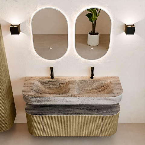 Natuurlijke materialen in warme tinten. De verticale ribbels brengen ritme en textuur in het ontwerp, terwijl het eikenhout zorgt voor een warme, ambachtelijke uitstraling. Kies uit 5 houttinten OAK, WALNUT, DUSK, SHADOW en RUBY zorgvuldig geselecteerde houtkleuren om zowel moderne als klassieke badkamers te verrijken.