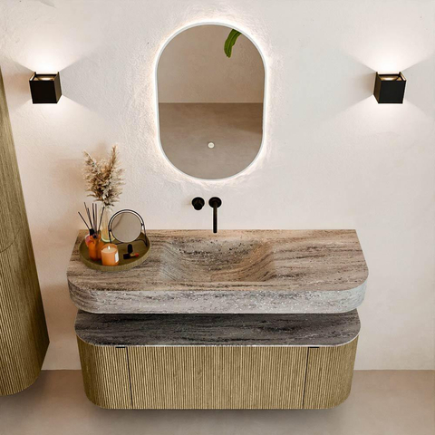 Natuurlijke materialen in warme tinten. De verticale ribbels brengen ritme en textuur in het ontwerp, terwijl het eikenhout zorgt voor een warme, ambachtelijke uitstraling. Kies uit 5 houttinten OAK, WALNUT, DUSK, SHADOW en RUBY zorgvuldig geselecteerde houtkleuren om zowel moderne als klassieke badkamers te verrijken.