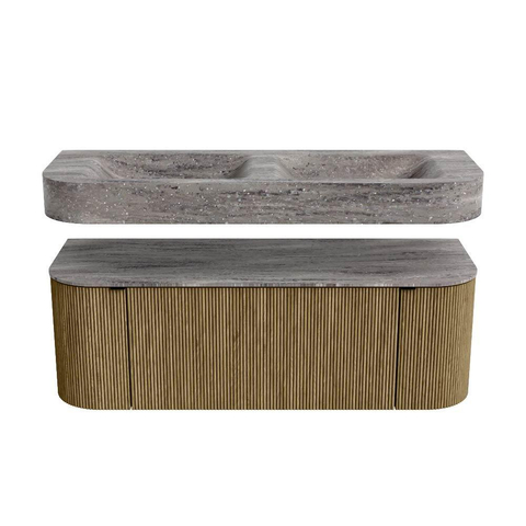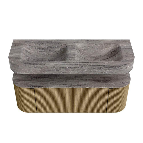 MONDIAZ THOR-DLUX 130cm badmeubel ronding links + rechts kleur Dusk met 1 lade en 2 deuren. Vrijhangende wastafel CLOUD Dubbel zonder kraangat kleur Oza.