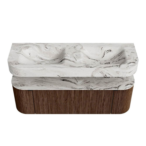 MONDIAZ THOR-DLUX 140cm badmeubel ronding links + rechts kleur Walnut met 1 lade en 2 deuren. Vrijhangende wastafel CLOUD Dubbel zonder kraangat kleur Glace.