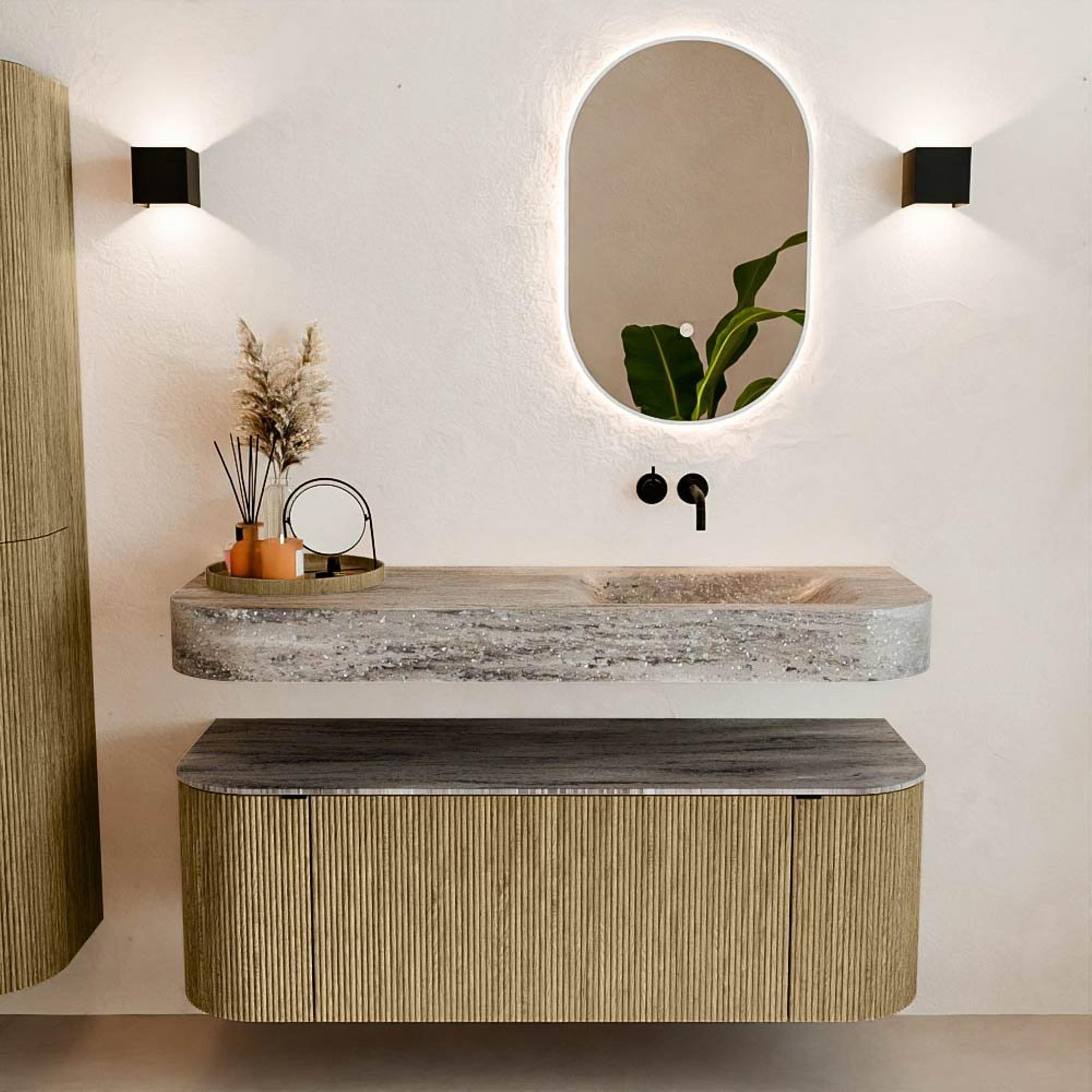 Natuurlijke materialen in warme tinten. De verticale ribbels brengen ritme en textuur in het ontwerp, terwijl het eikenhout zorgt voor een warme, ambachtelijke uitstraling. Kies uit 5 houttinten OAK, WALNUT, DUSK, SHADOW en RUBY zorgvuldig geselecteerde houtkleuren om zowel moderne als klassieke badkamers te verrijken.