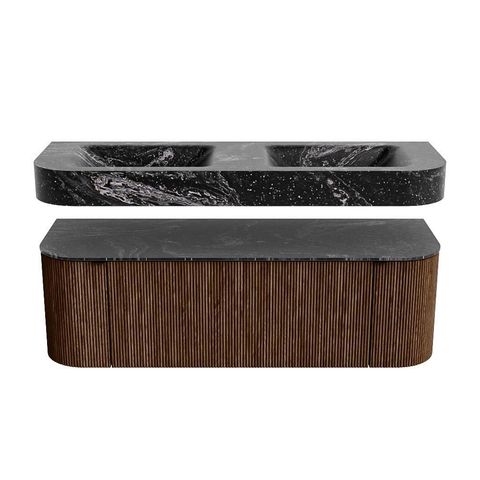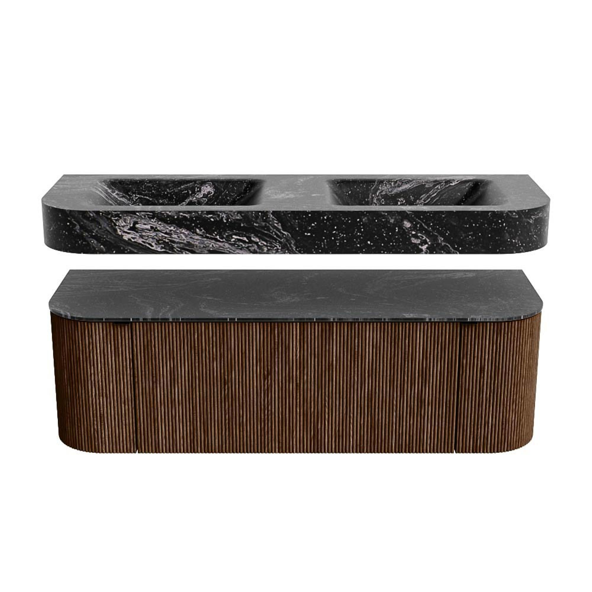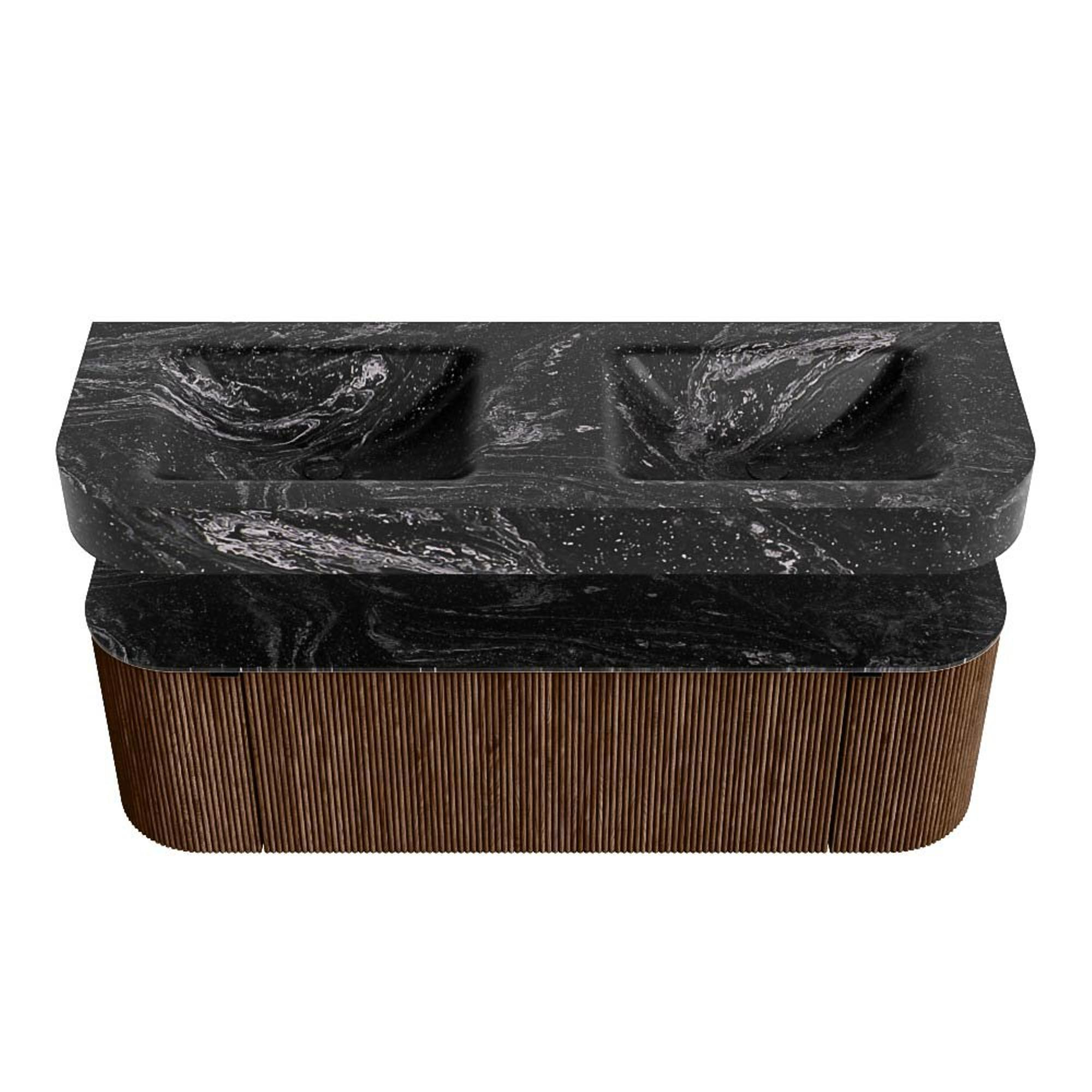 MONDIAZ THOR-DLUX 140cm badmeubel ronding links + rechts kleur Walnut met 1 lade en 2 deuren. Vrijhangende wastafel CLOUD Dubbel zonder kraangat kleur Lava.