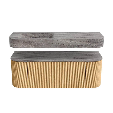 Boven het meubel zweeft een bijpassende, vrij hangende wastafel met afgeronde hoeken – perfect afgestemd op de vorm van de kast. De wastafel is uitgevoerd in Solid Surface en volgt subtiel de lijnen van het onderliggende meubel, waardoor een harmonieus geheel ontstaat. Het Solid Surface topblad vormt een sterke, onderhoudsvriendelijke basis en maakt de combinatie compleet.