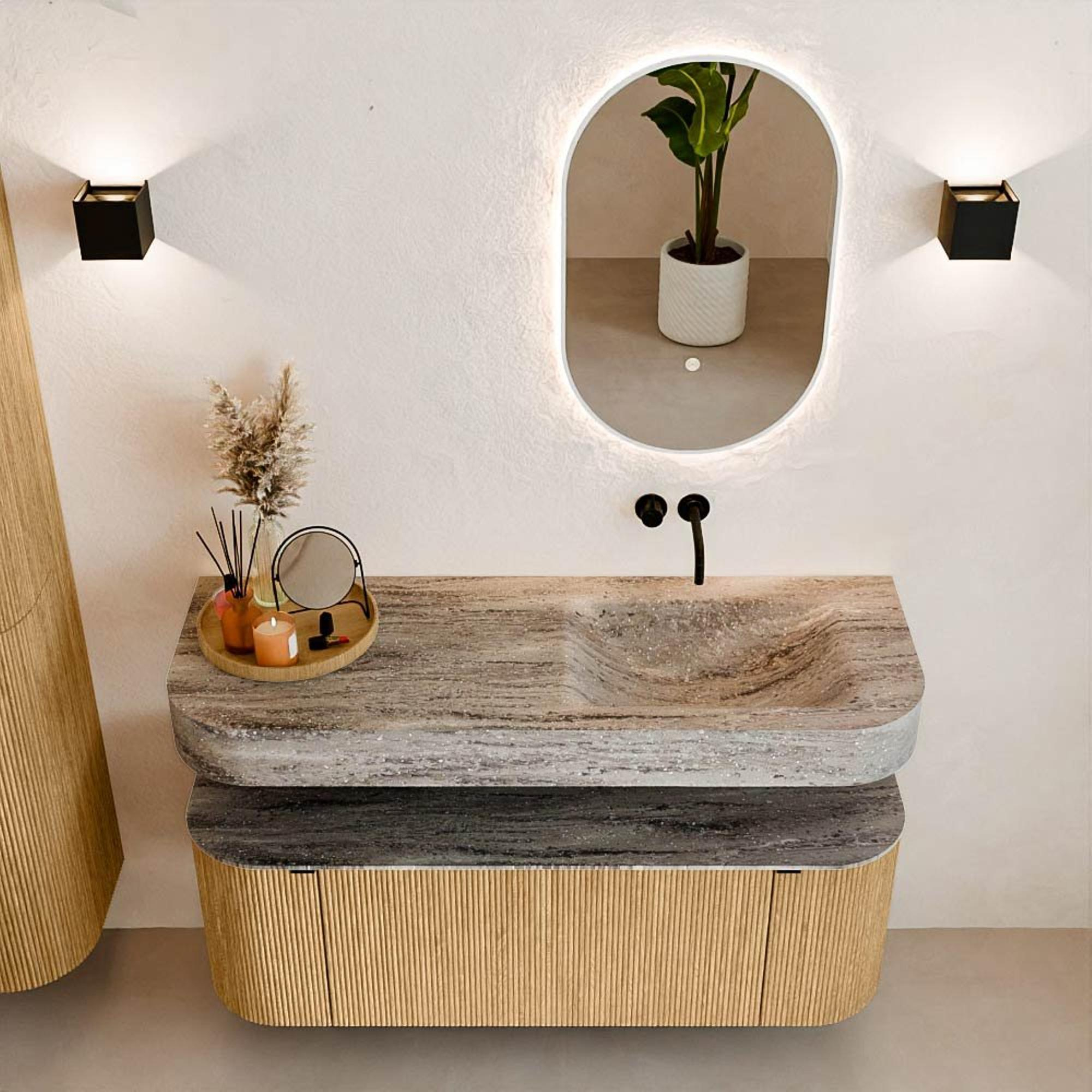 Natuurlijke materialen in warme tinten. De verticale ribbels brengen ritme en textuur in het ontwerp, terwijl het eikenhout zorgt voor een warme, ambachtelijke uitstraling. Kies uit 5 houttinten OAK, WALNUT, DUSK, SHADOW en RUBY zorgvuldig geselecteerde houtkleuren om zowel moderne als klassieke badkamers te verrijken.