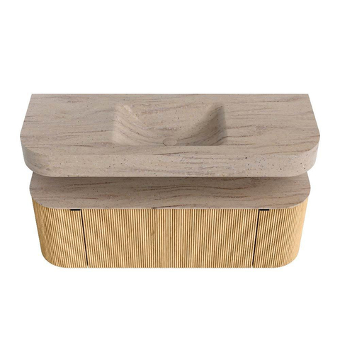 Boven het meubel zweeft een bijpassende, vrij hangende wastafel met afgeronde hoeken – perfect afgestemd op de vorm van de kast. De wastafel is uitgevoerd in Solid Surface en volgt subtiel de lijnen van het onderliggende meubel, waardoor een harmonieus geheel ontstaat. Het Solid Surface topblad vormt een sterke, onderhoudsvriendelijke basis en maakt de combinatie compleet.