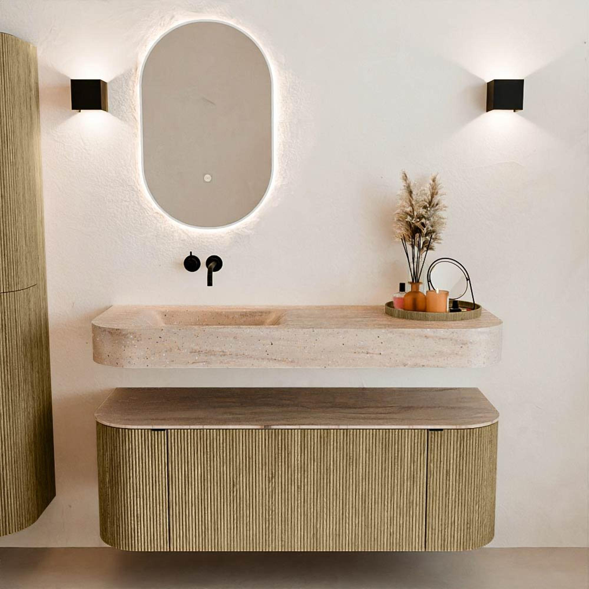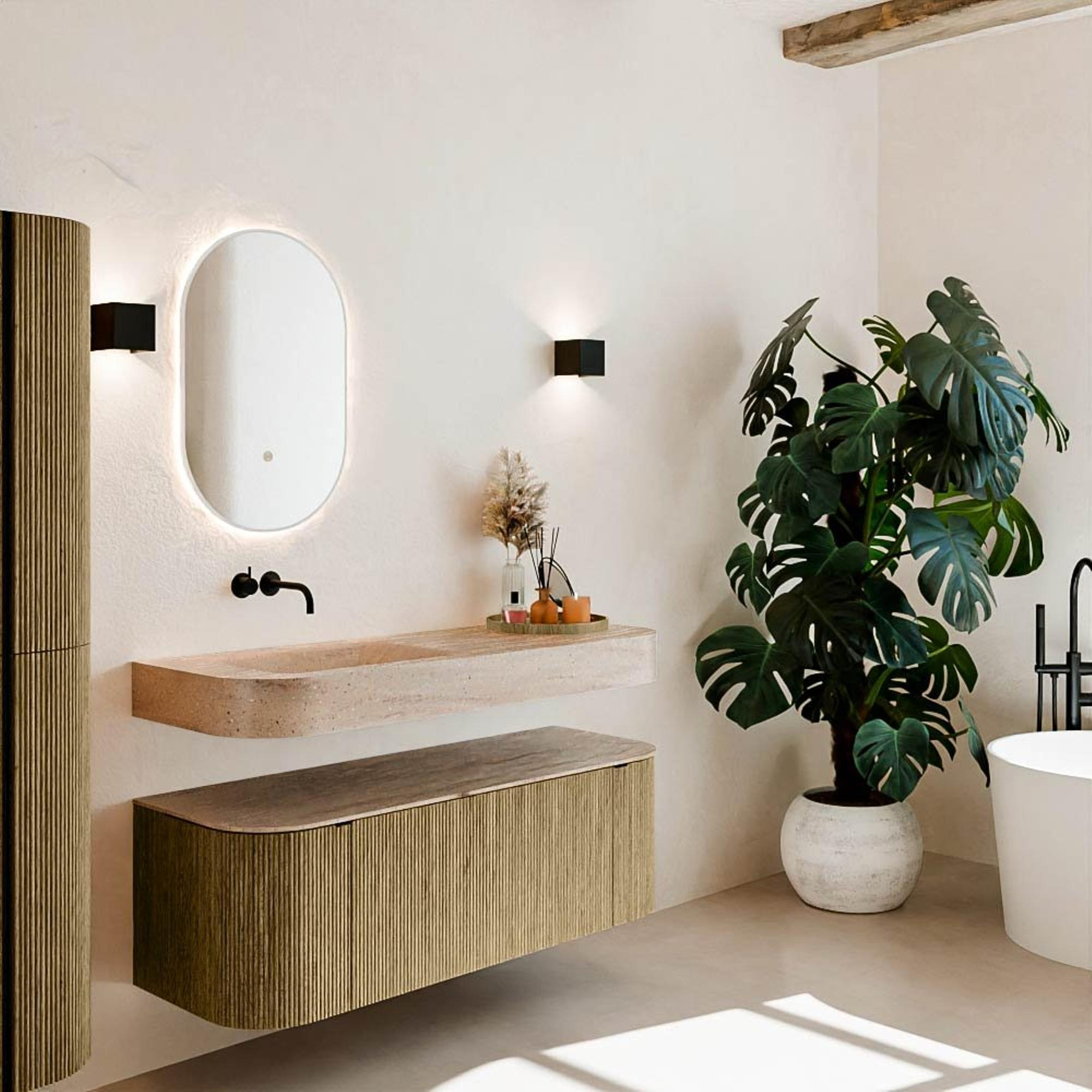 Natuurlijke materialen in warme tinten. De verticale ribbels brengen ritme en textuur in het ontwerp, terwijl het eikenhout zorgt voor een warme, ambachtelijke uitstraling. Kies uit 5 houttinten OAK, WALNUT, DUSK, SHADOW en RUBY zorgvuldig geselecteerde houtkleuren om zowel moderne als klassieke badkamers te verrijken.