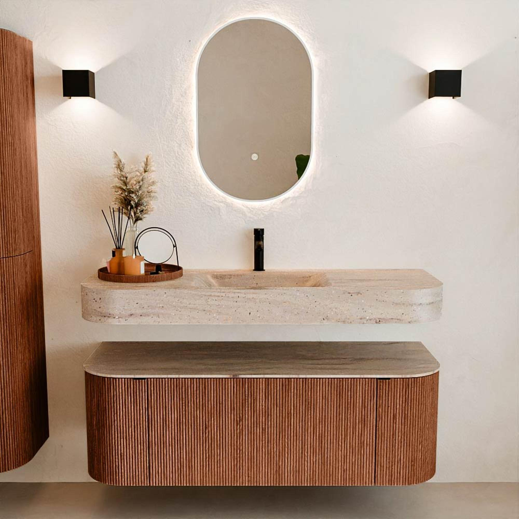 Natuurlijke materialen in warme tinten. De verticale ribbels brengen ritme en textuur in het ontwerp, terwijl het eikenhout zorgt voor een warme, ambachtelijke uitstraling. Kies uit 5 houttinten OAK, WALNUT, DUSK, SHADOW en RUBY zorgvuldig geselecteerde houtkleuren om zowel moderne als klassieke badkamers te verrijken.